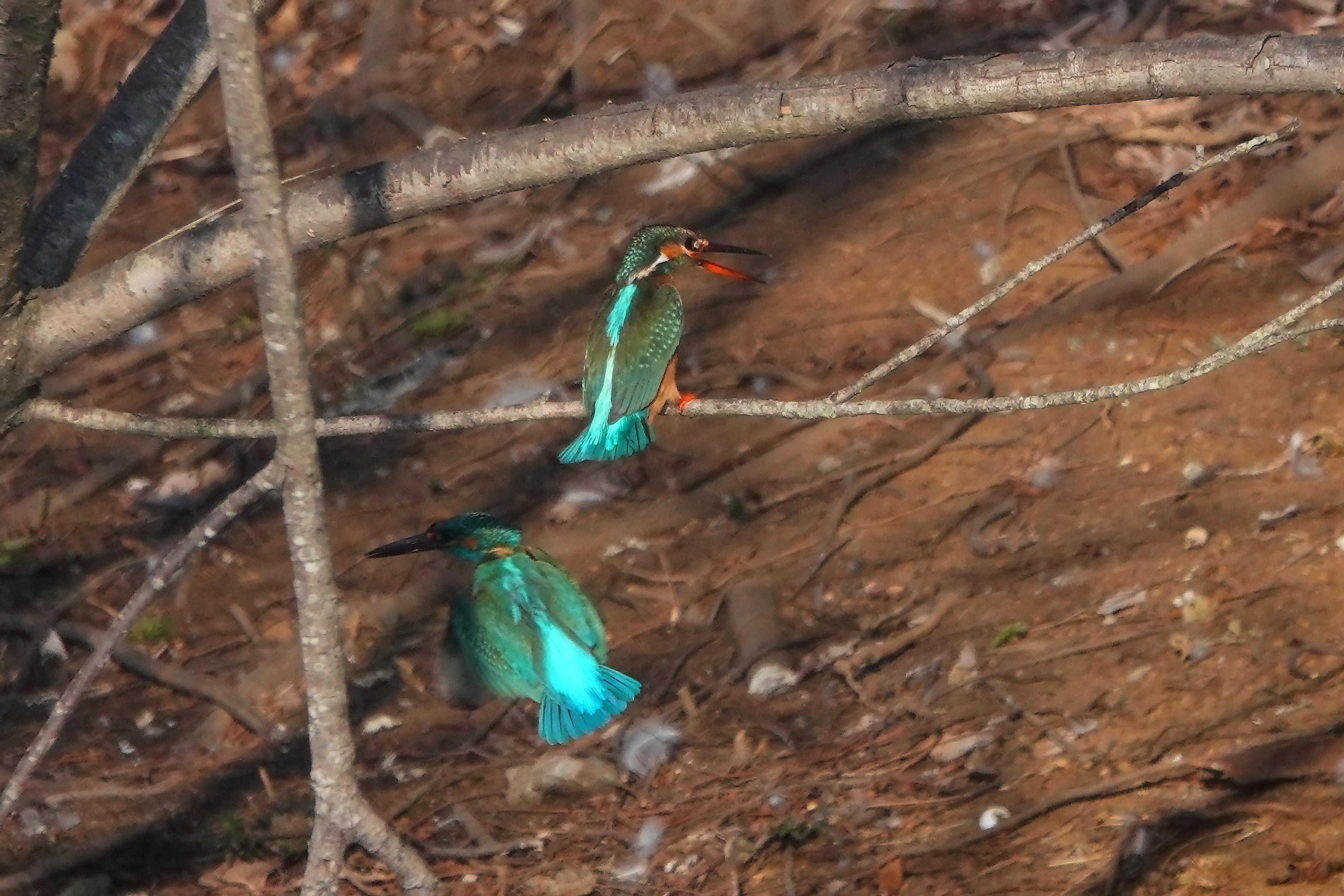 カワセミの恋の季節は、こちらオオハクチョウが越冬中の池にもやって来ました。