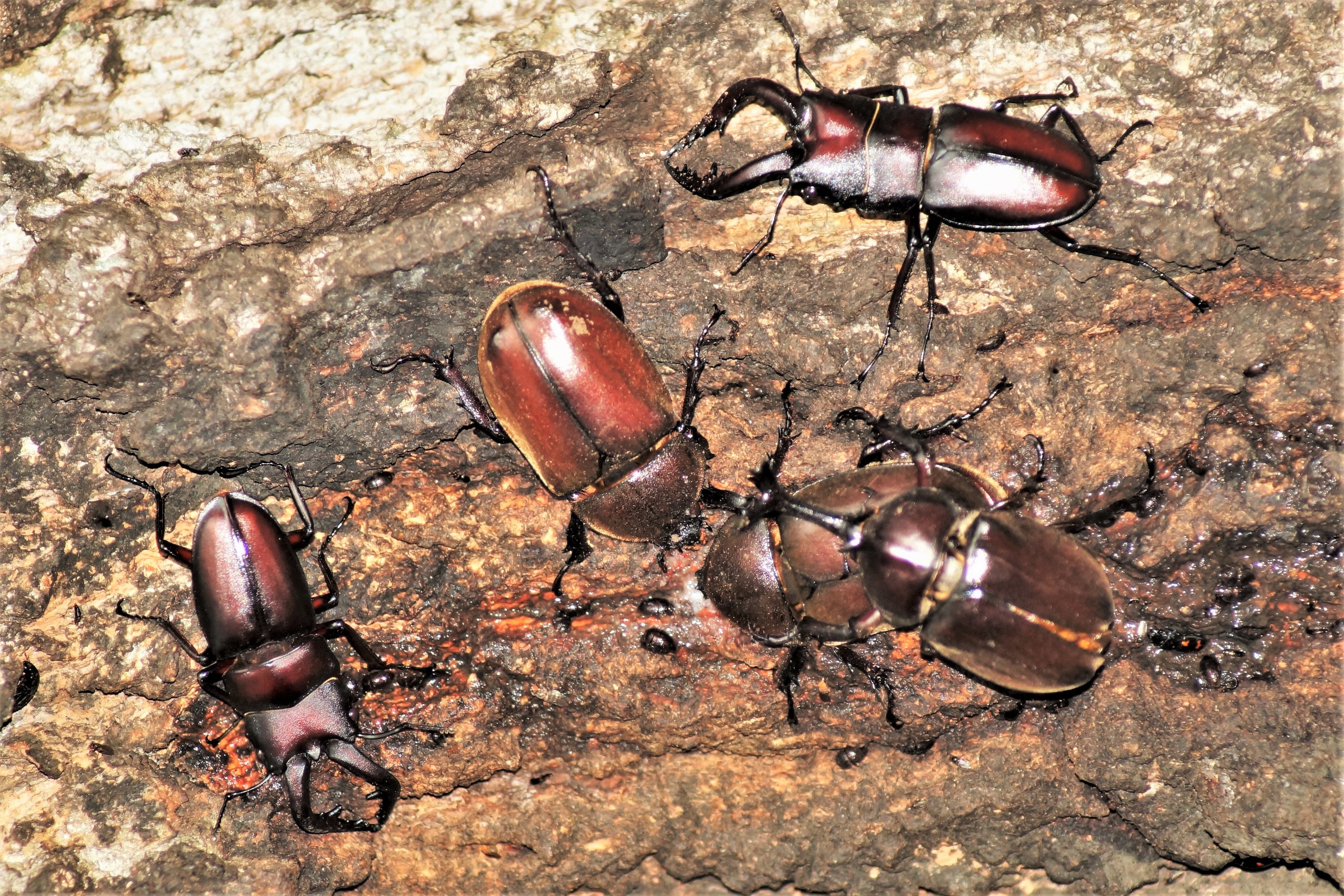 以前のいつもの公園には幾つかの樹液場があり、甲虫や蝶、雀蜂たちの採餌場となっていたが、近年は数が少なくなり、写真のような光景は見られなくなった。もしかすると人の入れない奥山にはいるかも知れないのだが・・・。写真は鋸鍬形(ノコギリクワガタ)、雌雄の兜虫、右側兜虫のすぐ後ろには、背中に赤い四個の星がある四星出尾虫(ヨツボシケシキスイ)が見られる。