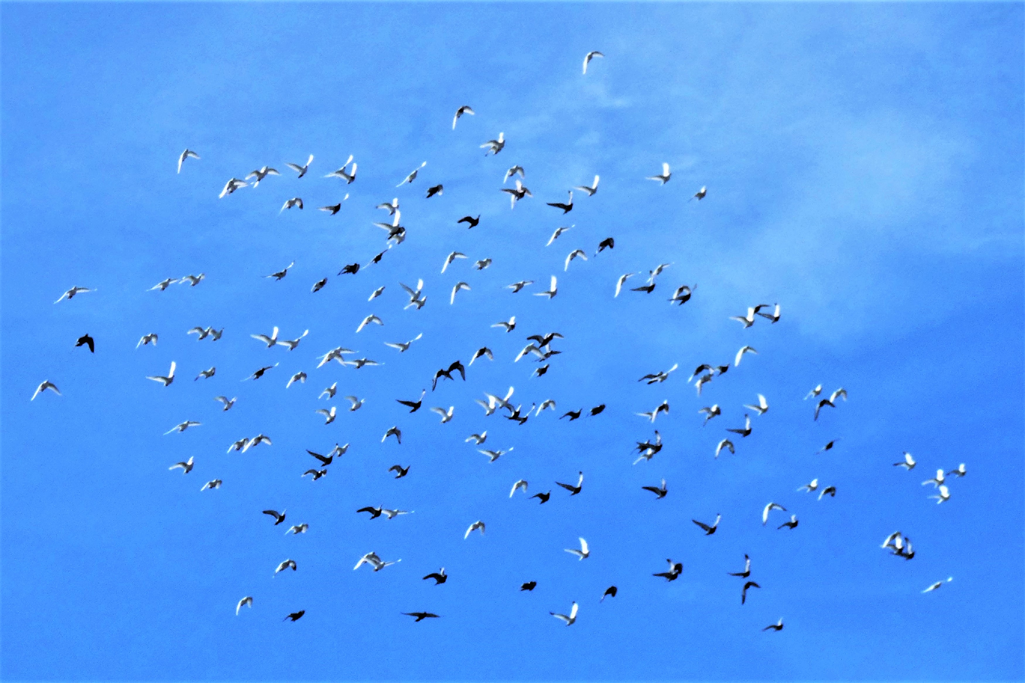 南風の強かった7月27日、野鳥の集団が当地上空を蛇行しつつ北方角に飛んで行った。最初は鳩と思ったが、PCで見ると白い鳥が多く、しかも翼の先端には黒い模様も見られた(写真一番下の白い鳥他など)。カモメかウミネコの集団のようだが、黒い個体もいるので、ウミネコかユリカモメの類か???  ネットで画像をクグッテみたものの写真のような集団飛翔は見られず不明でした。ちなみに当地は海岸線から20km程離れています。