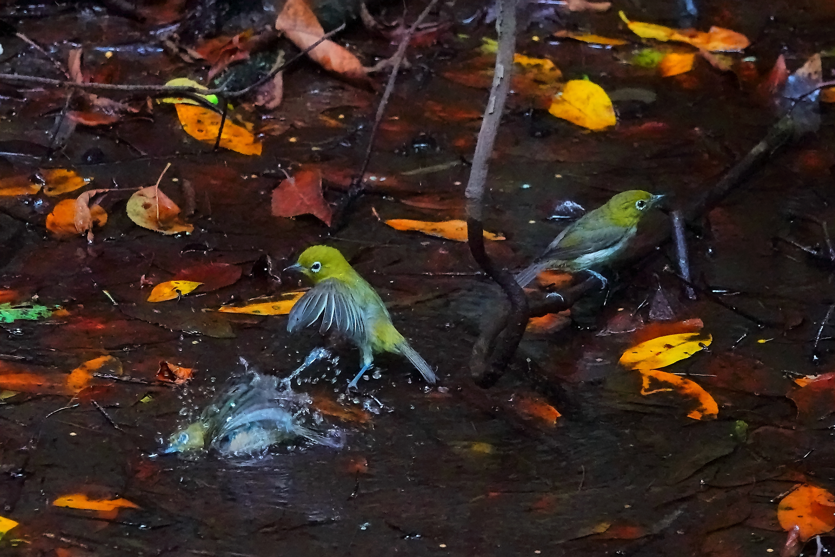 水場に下りて来た3羽のメジロ。早速1羽が激しく水浴びを開始。