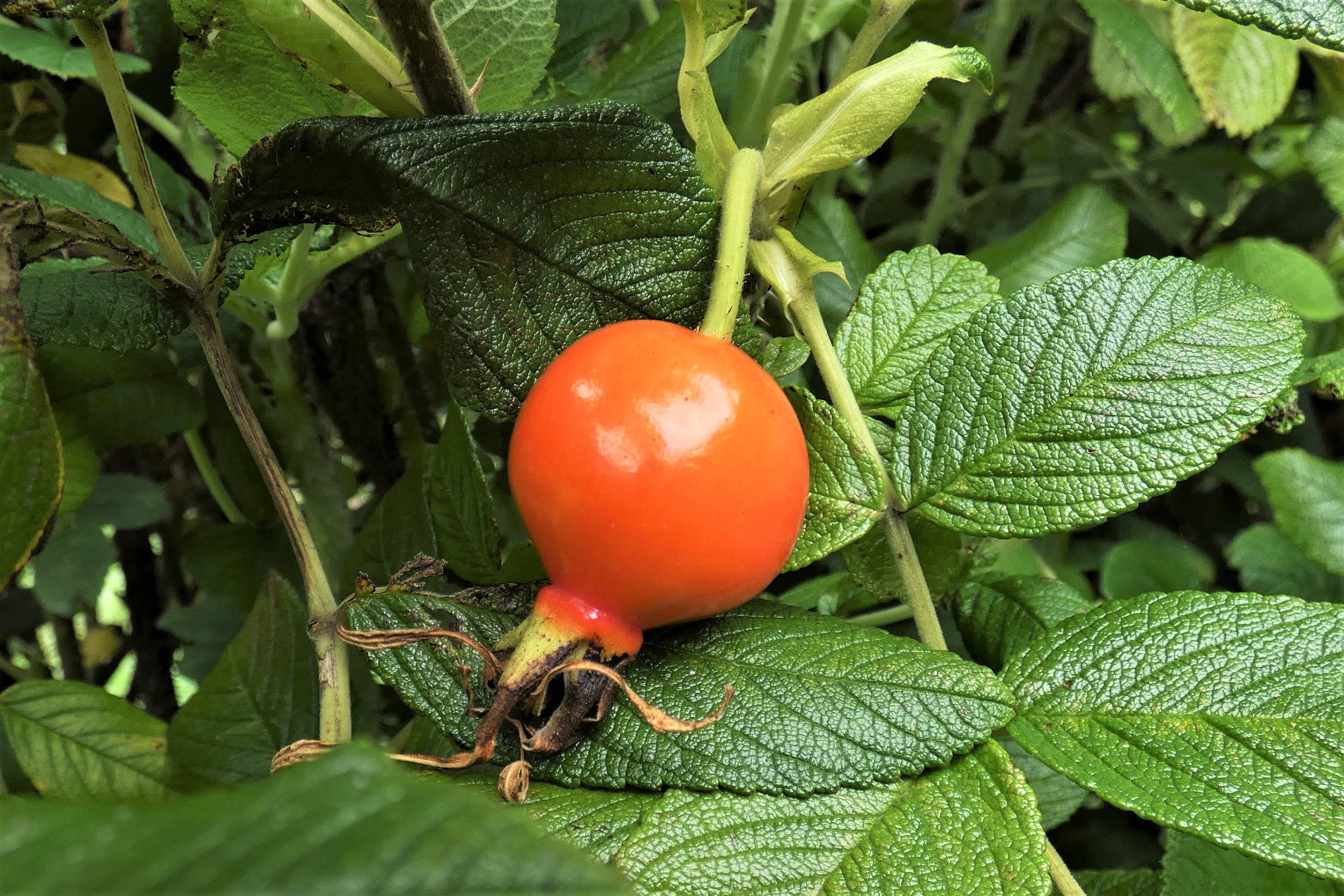 薔薇園では薔薇の実(ローズヒップ)の成る季節を迎えているが、写真はハマナスの品種改良から生まれた「ロサ・ルゴサ・スカブローサ」の実。薔薇の果実はビタミンCが豊富でレモンの60倍もあるという。以前、野薔薇などのローズヒップを集めてローズヒップ酒を作ったが下戸の為飲むことはなかった。利尿作用、発汗作用、血行促進、風邪予防などの効能があるという。