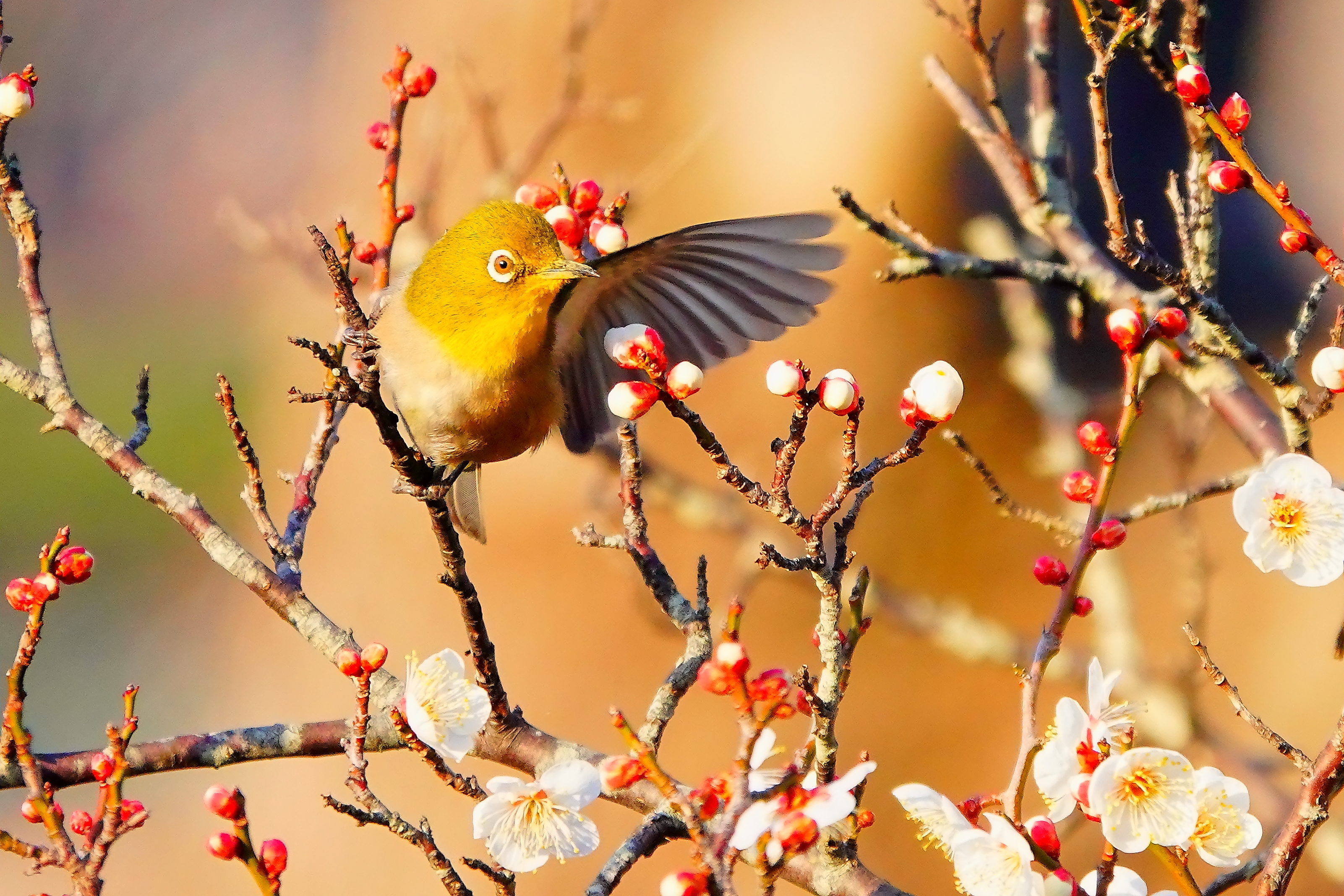 とても華やかでいいですね。梅の花の白さと蕾の赤み、メジロの黄色みと目の白さ。しかも羽を広げる瞬間を撮ってて。こうやるといい写真になるんだと勉強になります。