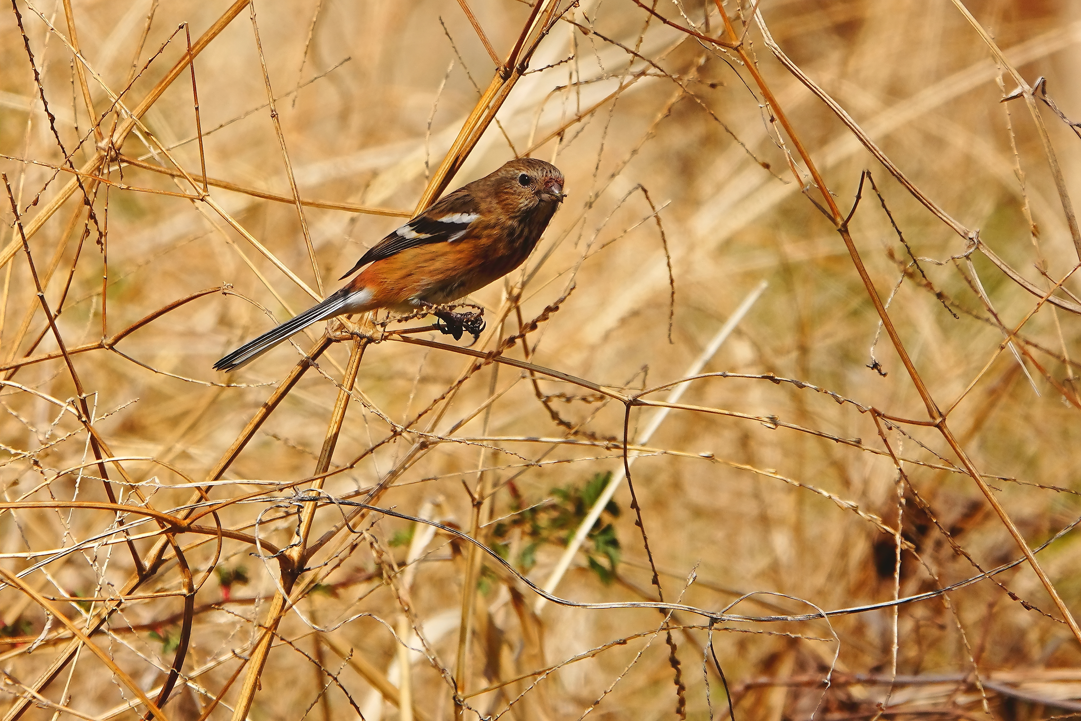 草の実を口に咥えた紅猿子(ベニマシコ)の雌。