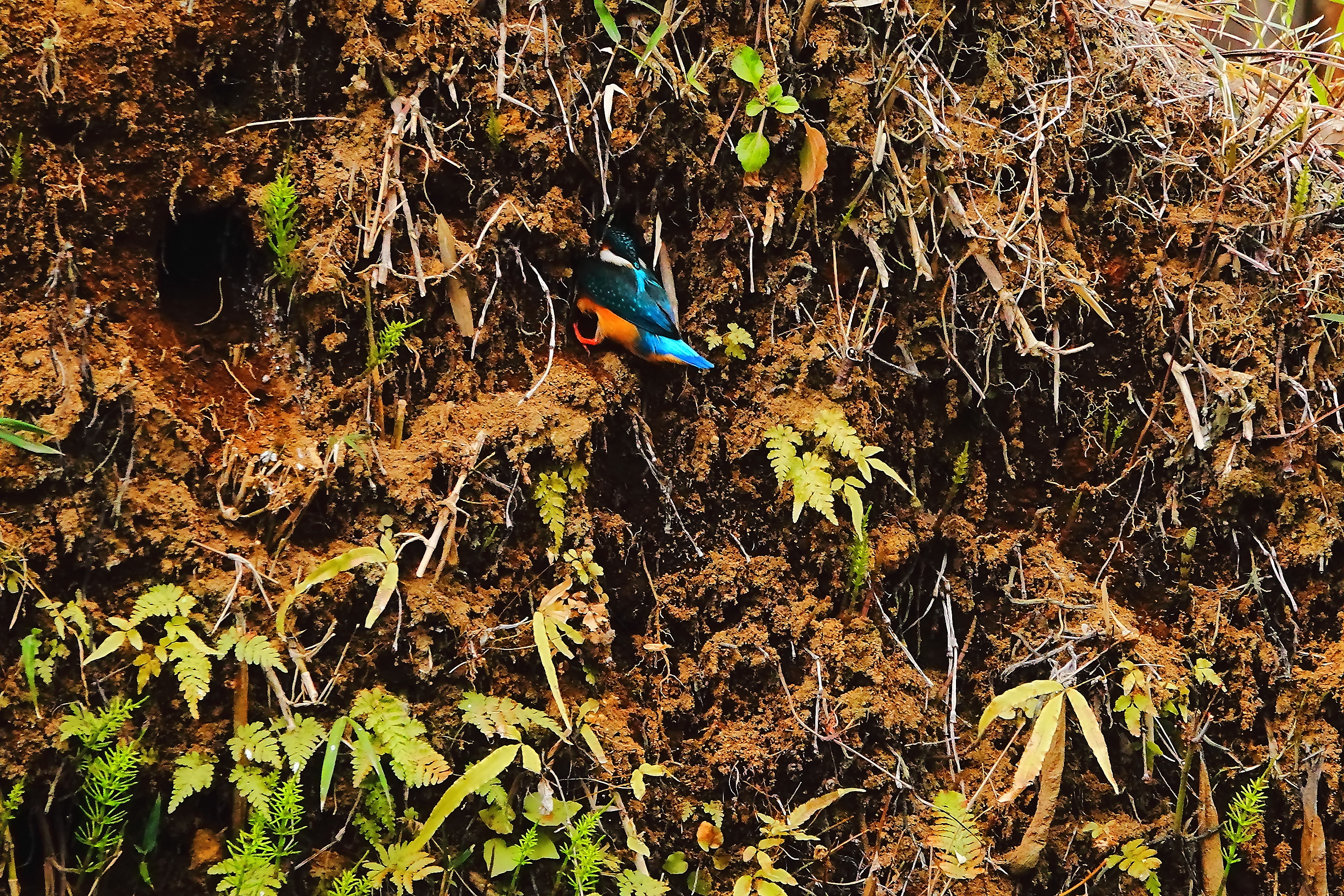 【翡翠カップルの巣穴掘り:6連作の3】 前作から30分後、この間カワセミの雌は数回同じ巣穴に飛び込み穴掘りをしていました。こちらの巣穴はまだそれほど深くないようで足で泥をはじき出しなが尻から出て来ました。(連写して分かりましたが、本作の静止画1枚だけでは分かりにくいです)