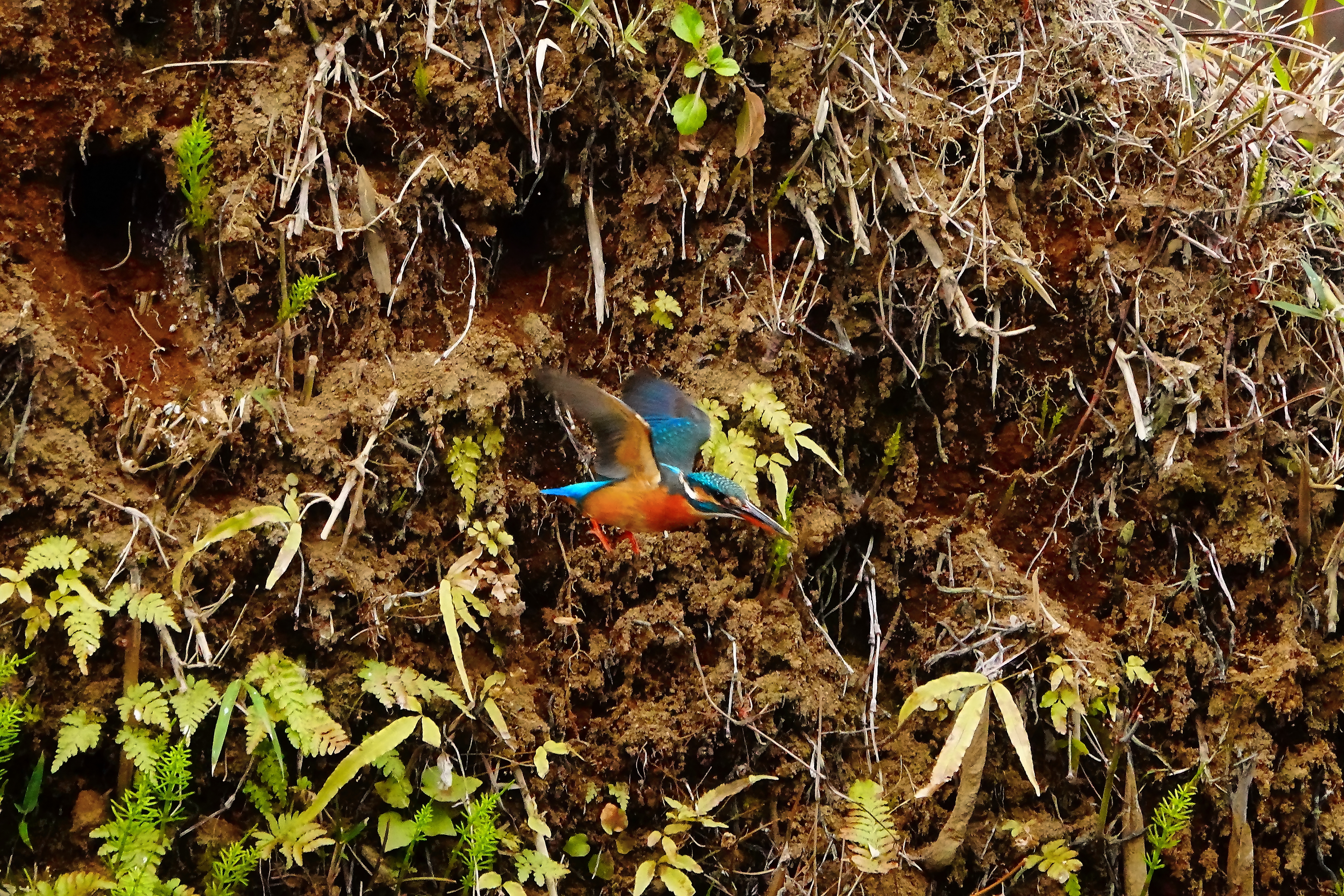 【翡翠カップルの巣穴掘り:6連作の5】 画面上の中央付近の巣穴から飛び出したカワセミの雌。