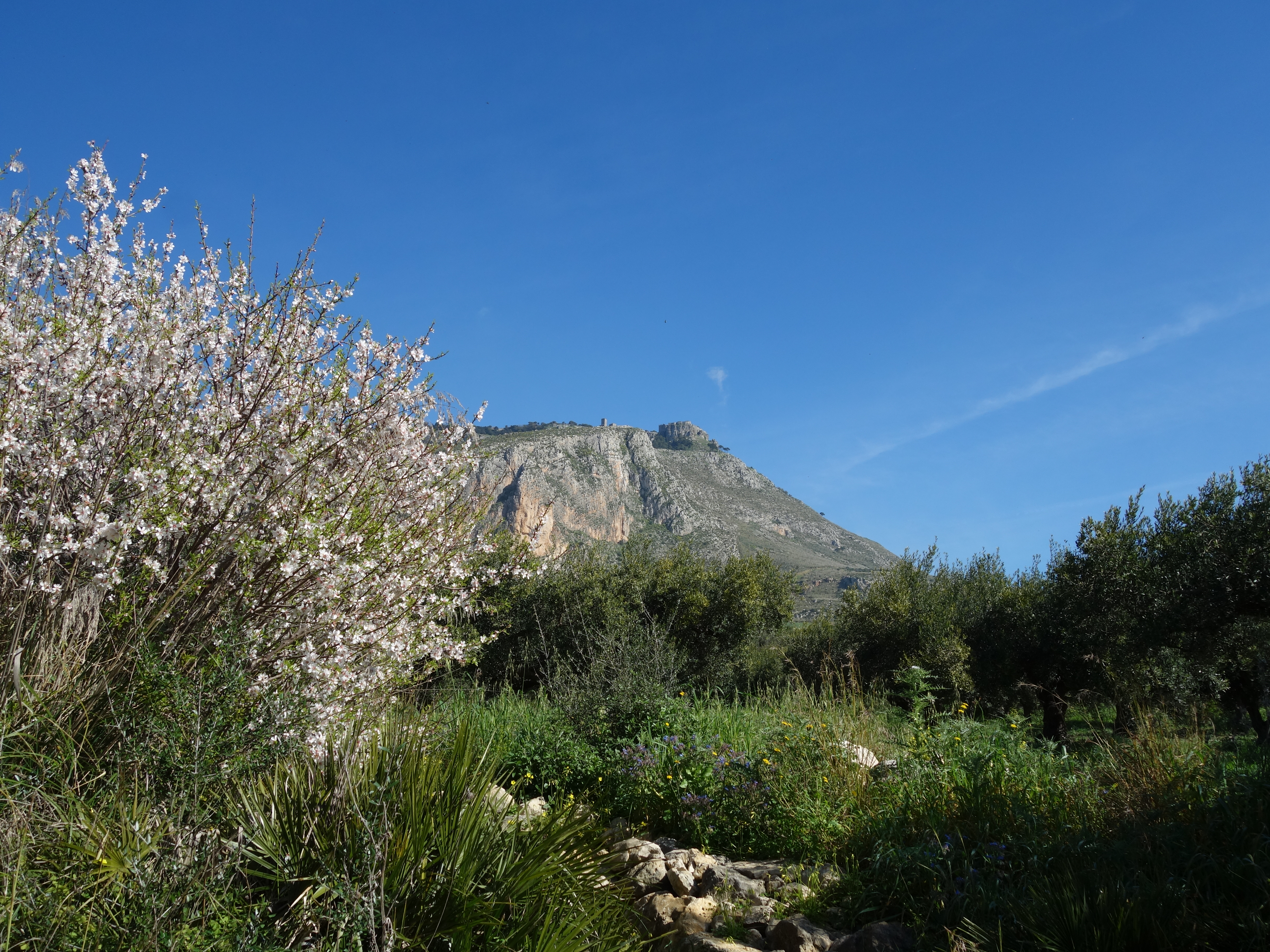 アーモンドの花、そろそろ、散ります。葉桜ならぬ葉アーモンドが近いです。後方はエリーチェ山。