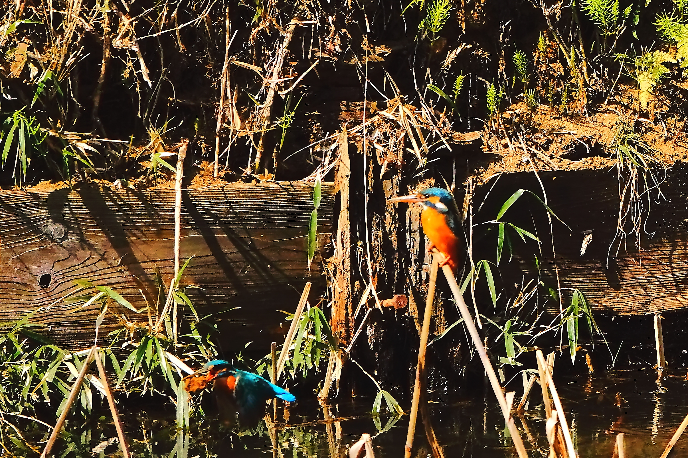 【翡翠カップルの巣穴掘り:6連作の6】 前4作品の巣穴掘りは雌でしたが本作では画面右の雌が見守る中、雄が何と自分の頭程の大きな土の塊を咥えて巣穴から飛び出して来ました。かなり深く掘っているようです。