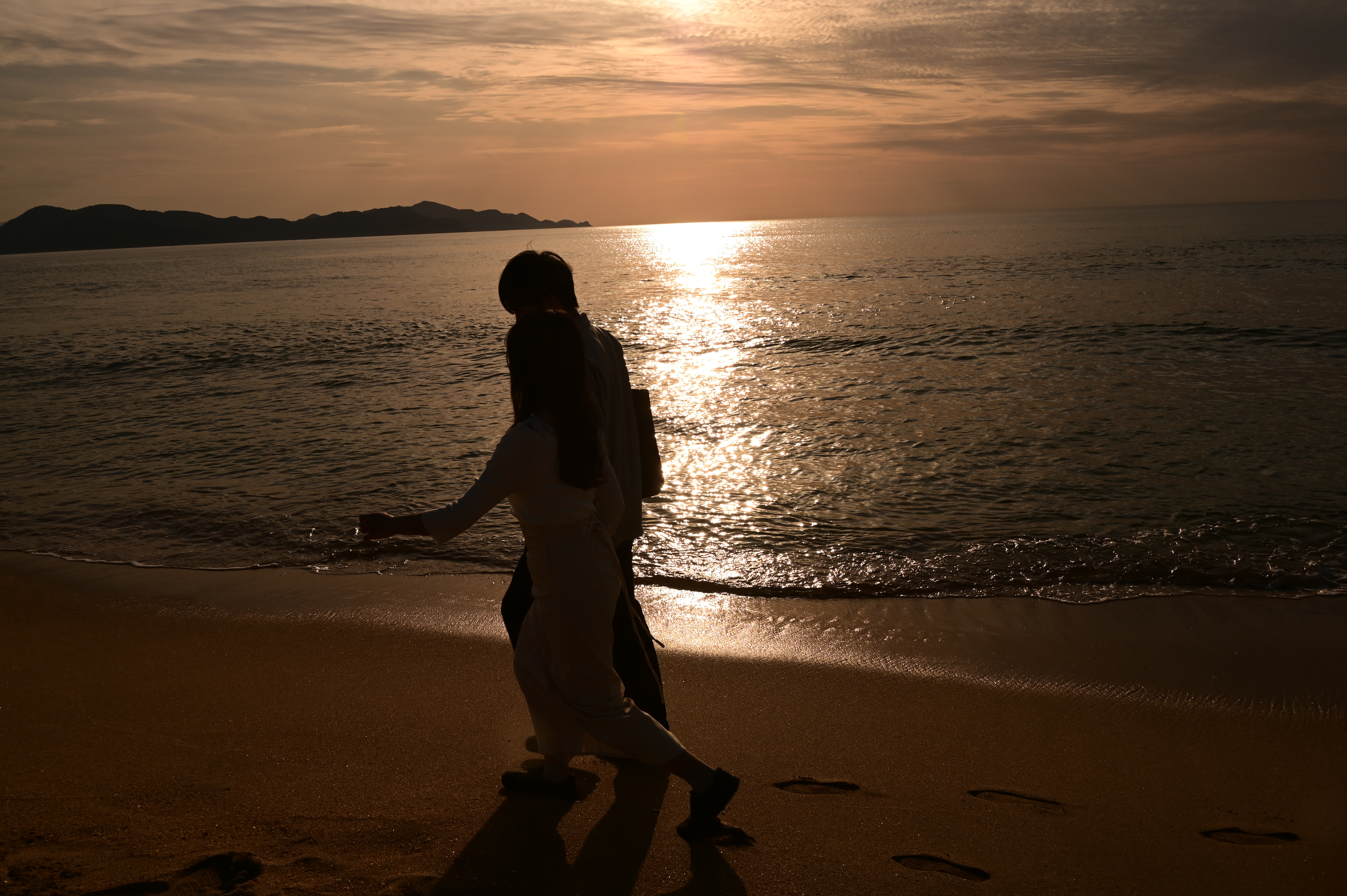 波打ち際で足跡を付けながら、急ぐカップルさん。