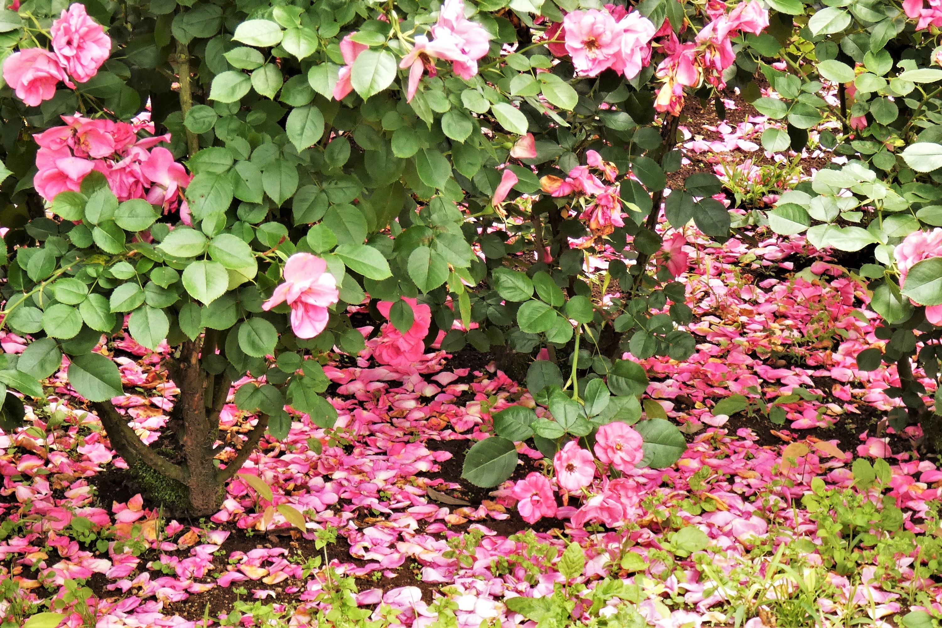 薔薇には四季咲きがあるが、春薔薇の花期が終わりを迎えている。写真の薔薇は「ラ・ピンク・セビリアーナ」。フランスのメイアン社の作出で、花言葉は情熱、愛情、あなたを愛しますでした。散った花弁が地面を華やかに飾る光景は、有終の美さえ感じられました。