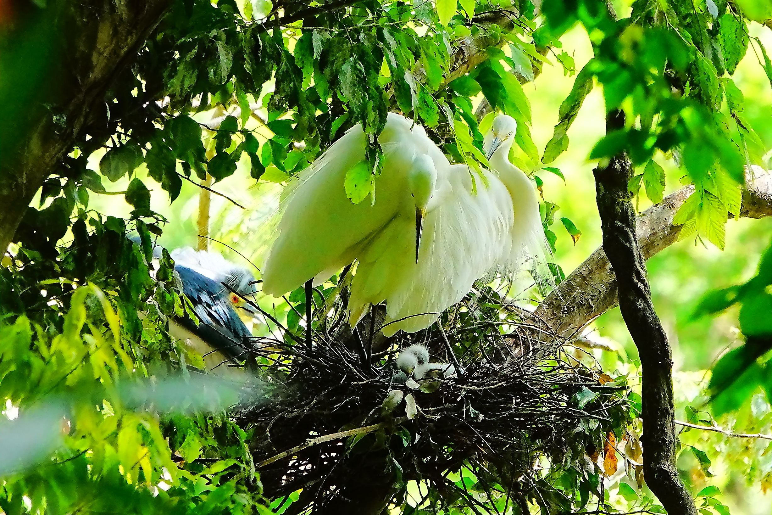 画面左でじっと雛を見つめるゴイサギ。そちらも早く子育てをしなくちゃね。
