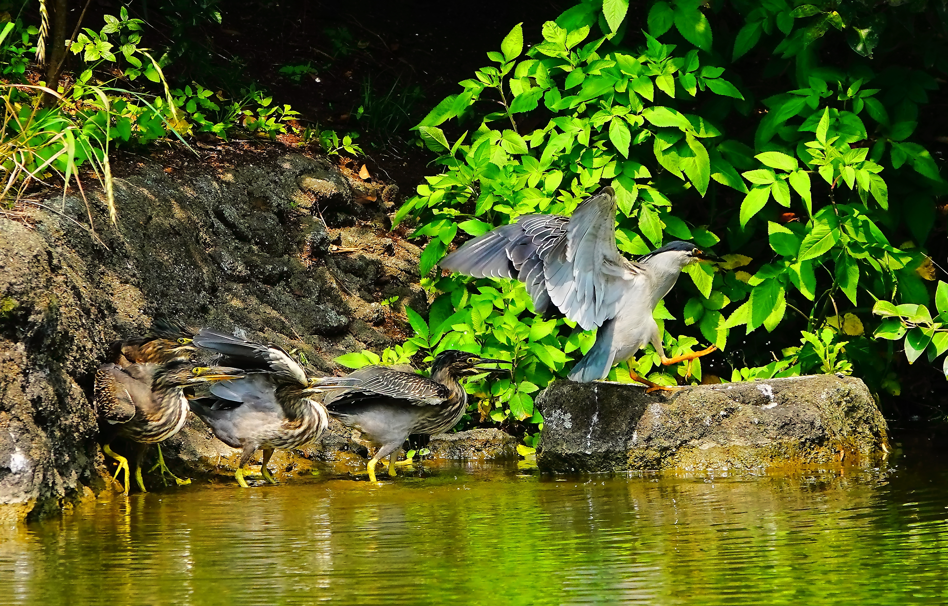 子供4羽から餌をねだられ、追い回されるササゴイの親。
