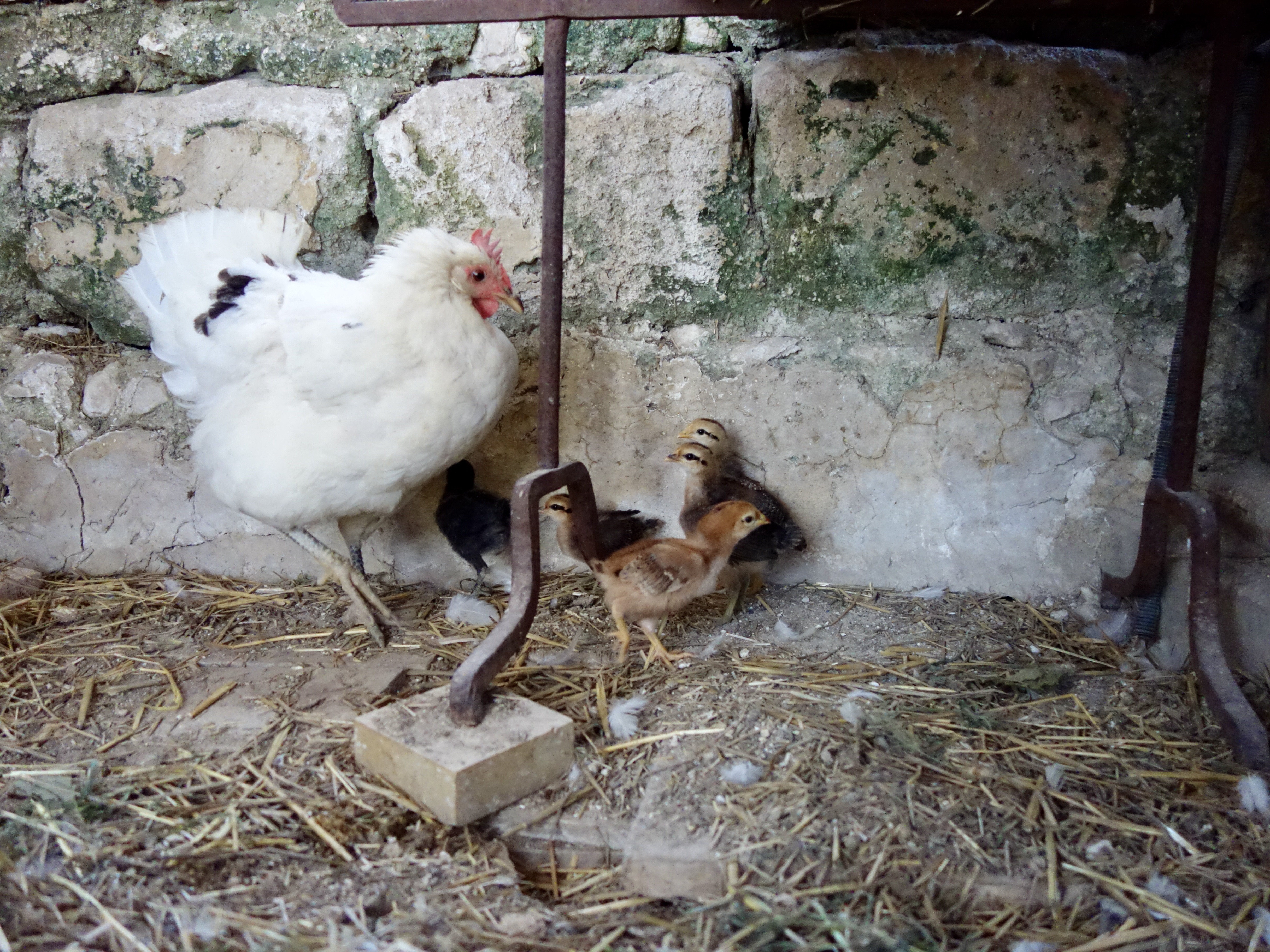 あすで生後2週間のヒヨコたち5羽。かあちゃんの言うことを聞いているようで・・・親も子も、暑い中、がんばってます。