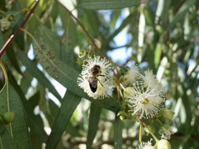 コアラは、いないけど、ユーカリの木は、たくさんあるシチリアです。高温乾燥の夏、草花が枯れて、見る花が減る中で、ユーカリの花がけなげに咲いています。