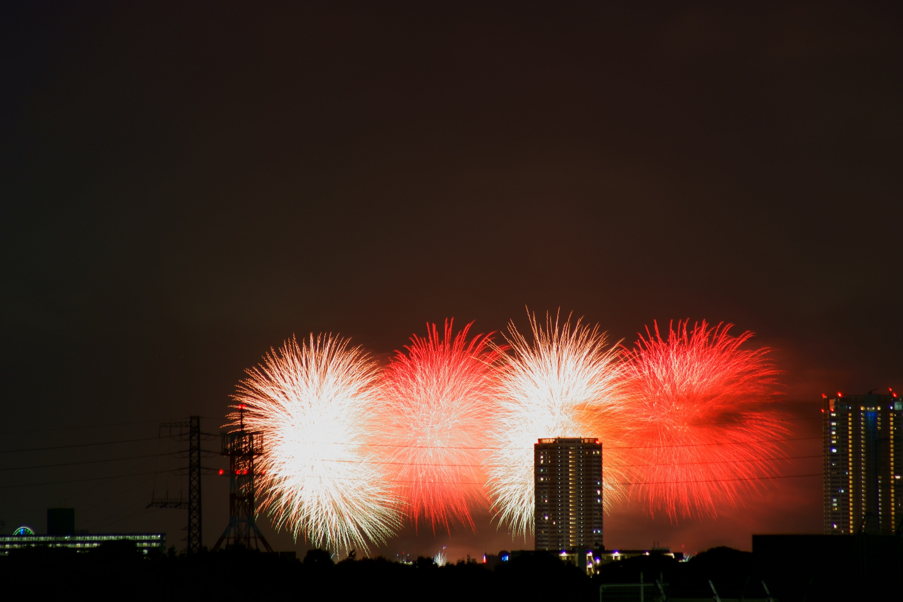昨日五日は近隣数か所で花火大会が行われた。先ずは我家のベランダからよく見える、江戸川区花火大会と市川納涼花火が江戸川の河川敷で、「合同」で行われ、合計2万8000発が上がった(写真)。同じ日に行われた「幕張ビーチ花火(千葉市民花火大会)」も見えた。ほかに、柏手賀沼花火大会(13500発)、習志野駐屯地夏祭(850発)、松戸花火大会(25000発)、板橋花火大会(13000発・河川敷火災で途中で中止)等が行われた。