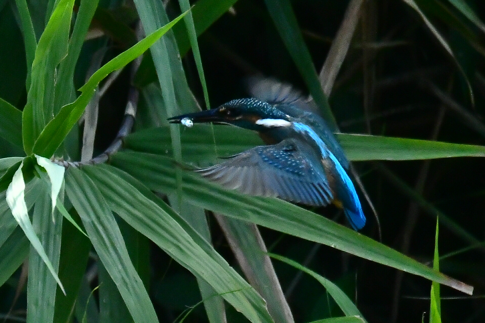 獲物をゲット葦の間で羽ばたく翡翠