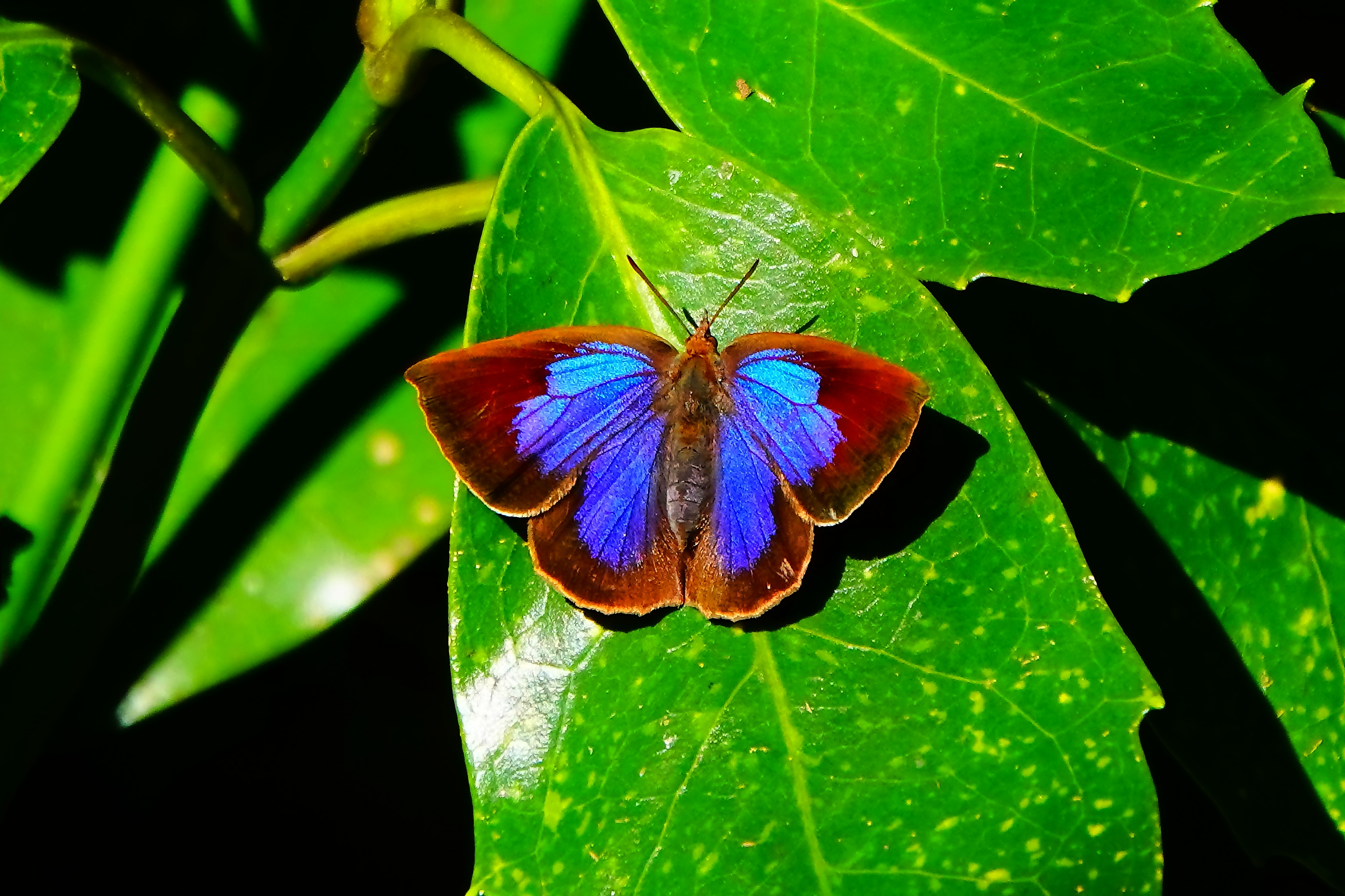 翅の表が青紫色で魅惑的な美しさです。