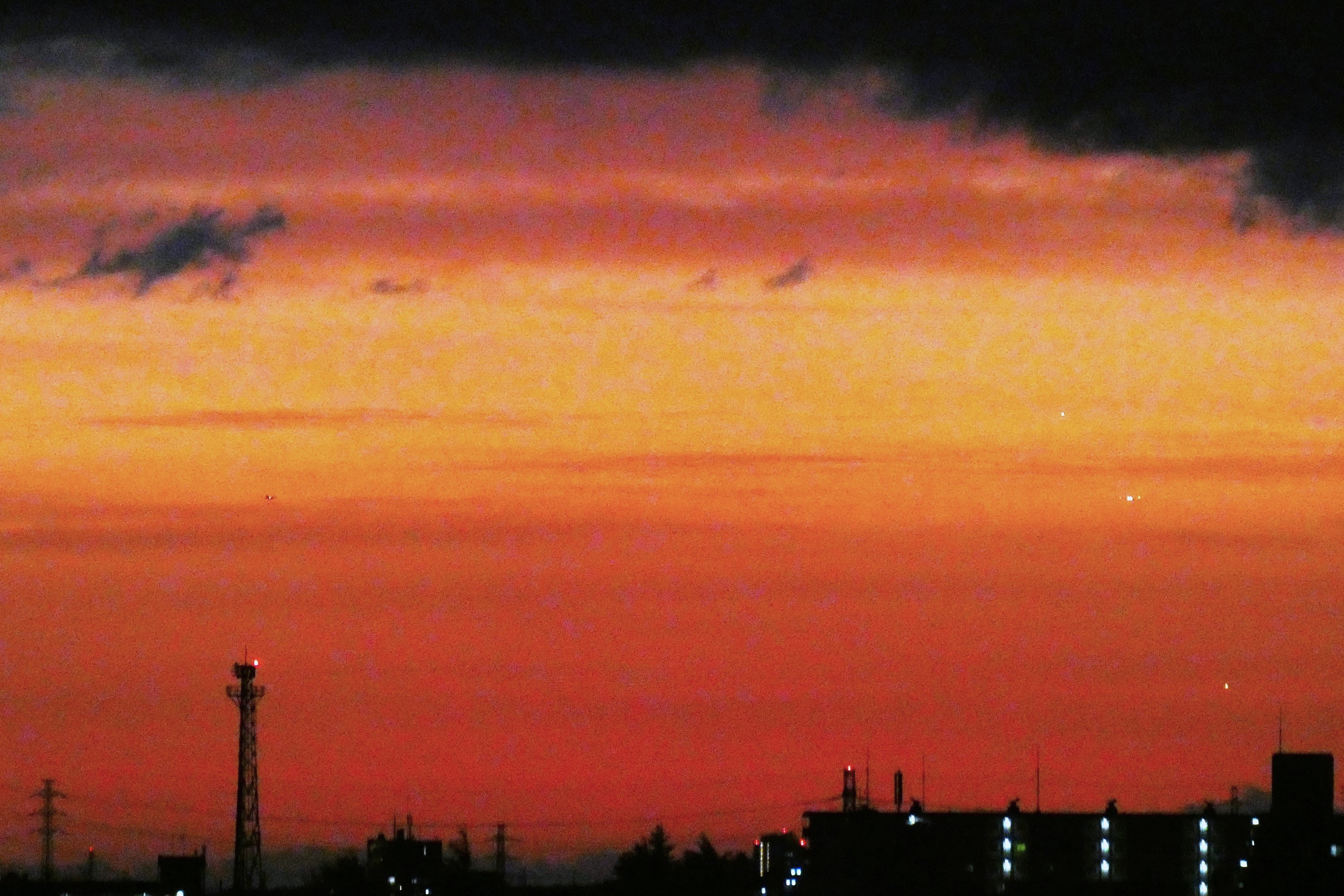 日出前の朝焼けを撮っていると、星のような明かりが…しかも動いている。北風の時はに進入路になっている成田空港に向かう航空機のライトである。拡大すると良く判るが、左の鉄塔の上に一機、右のビルの上に3機のライトが見え、上から二番目は機体の左右のライト迄確認出来た。夜明け前の帰国ラッシュなのだろう。