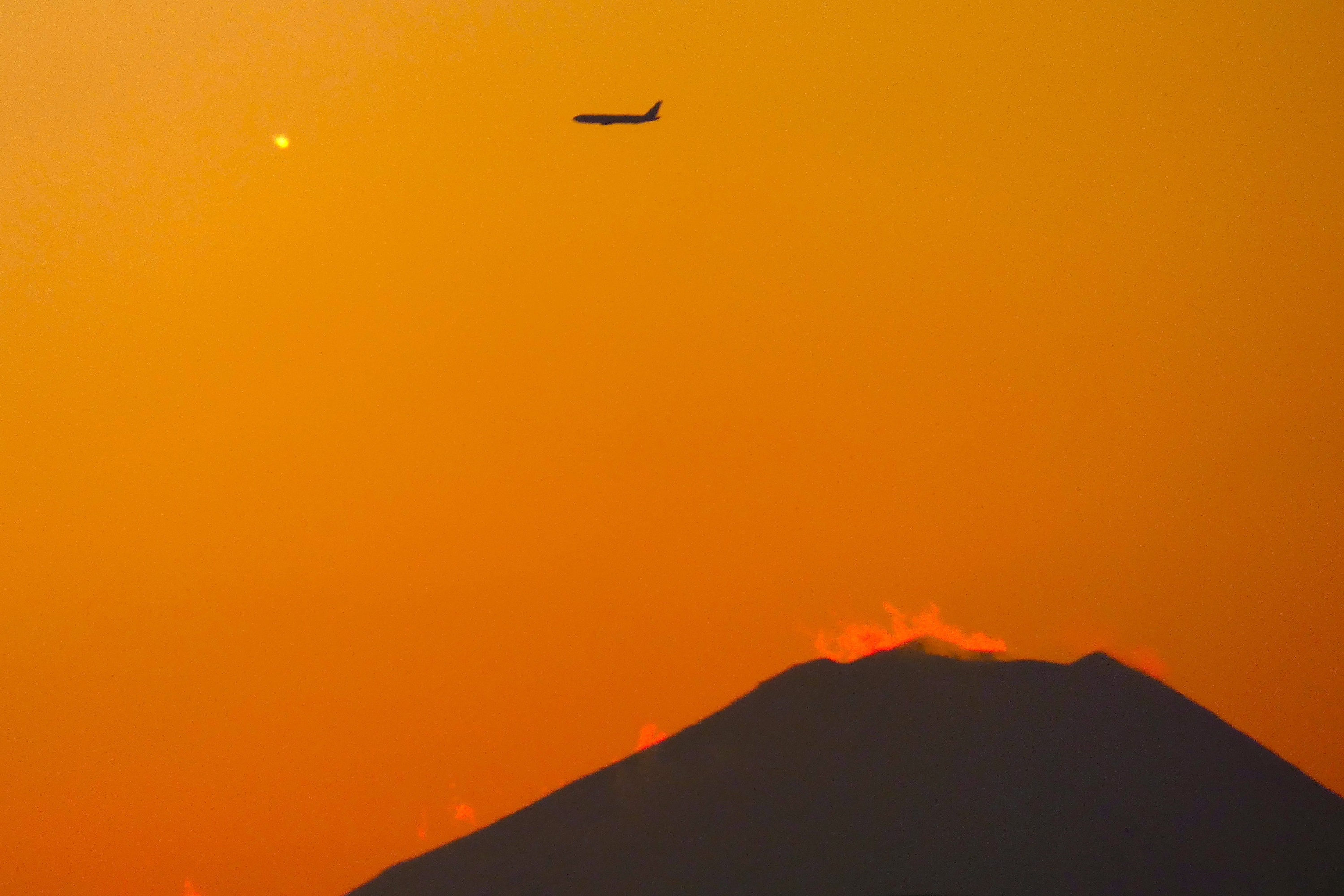 日没後の富士山をバックに都心上空から羽田に向かっている旅客機がありました。南風や南西の風があると羽田への着陸は当地上空を経て埼玉南部から都心上空を飛んで羽田へと向かいます。旅客機の前に輝いている星のようなものは、西に向かっている国際線の旅客機かと思われます。