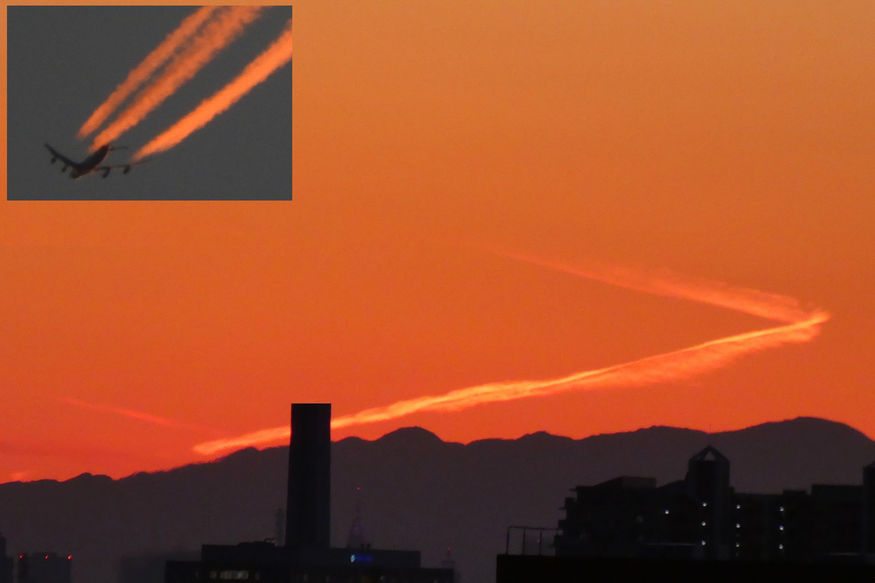 昨日の残照の西空に茜色の飛行機雲が見られた。その形からして離陸後の航跡のようで、この方面にあるのは米軍横田基地で、そこからの離陸機のようである。ちなみに横田基地からと思われる軍用機は時折当地上空から北東に飛んでいることがある。写真左上には以前に撮ったのを貼付したが、ジェットエンジンが4発であることからジャンボ機のような大きさの輸送機のようである。(写真中央左の焼却場の煙突は上部をカットしています)