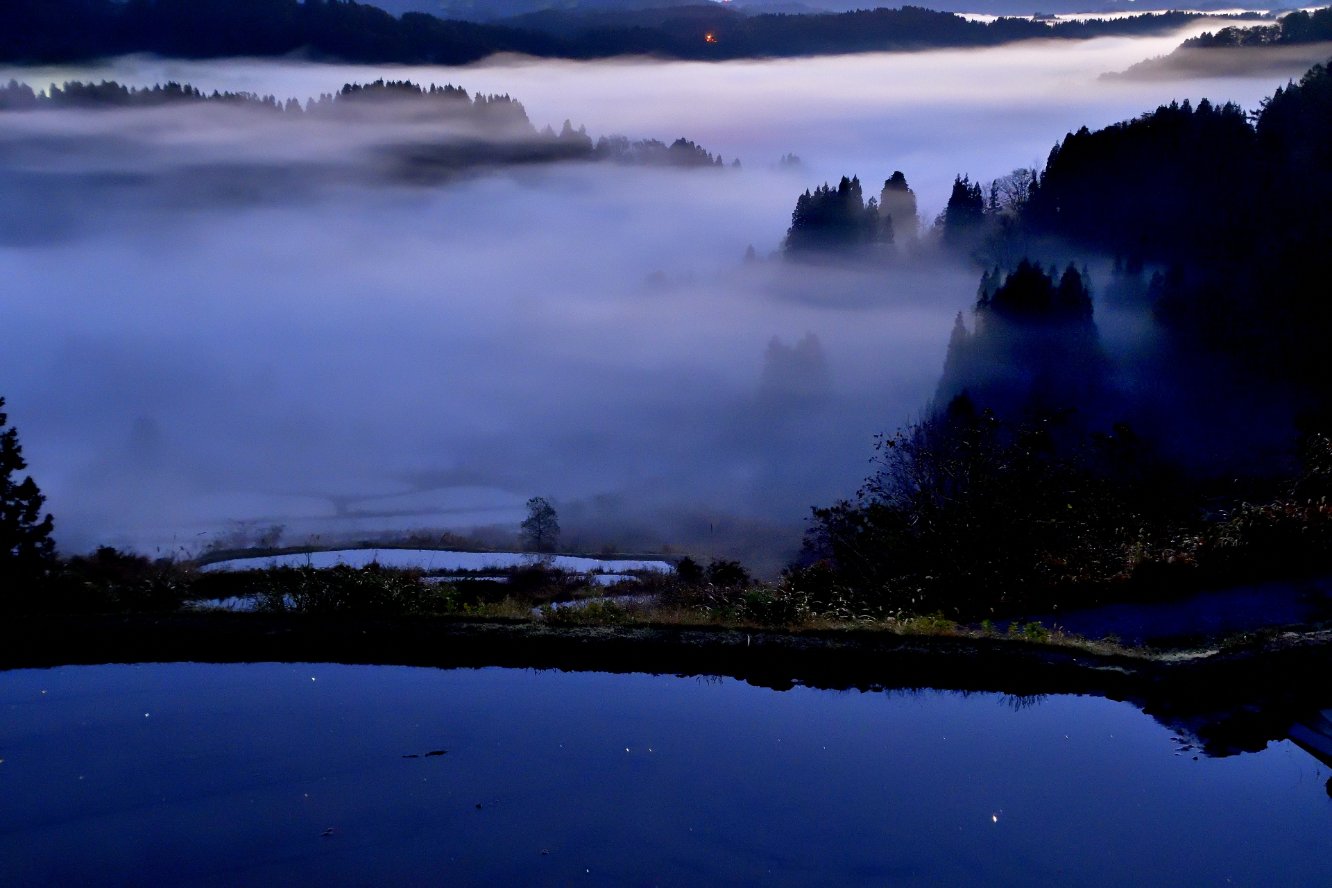 手前の棚田の水面には星が映り、雲海の奥には朝の明るさが広がっています。