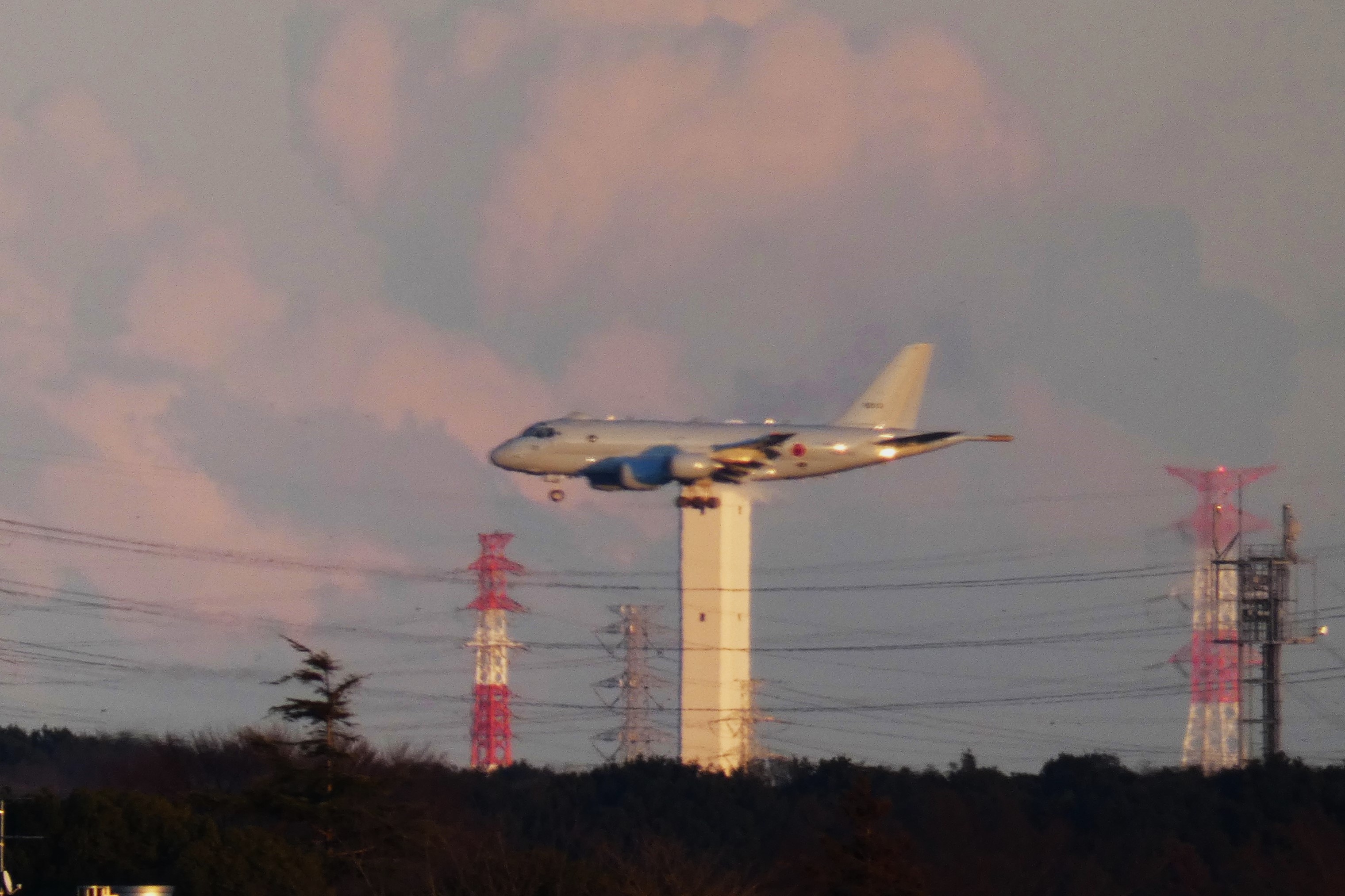 機体に夕日を受けて輝きながら下総基地に向かっている第三航空隊のP-1対潜哨戒機です。第三航空隊は厚木基地の所属ですが、分隊が下総基地に配備されたようで、昨年の開設記念行事を見学したときには、それまでなかったP-1専用の第4格納庫が出来ていました。