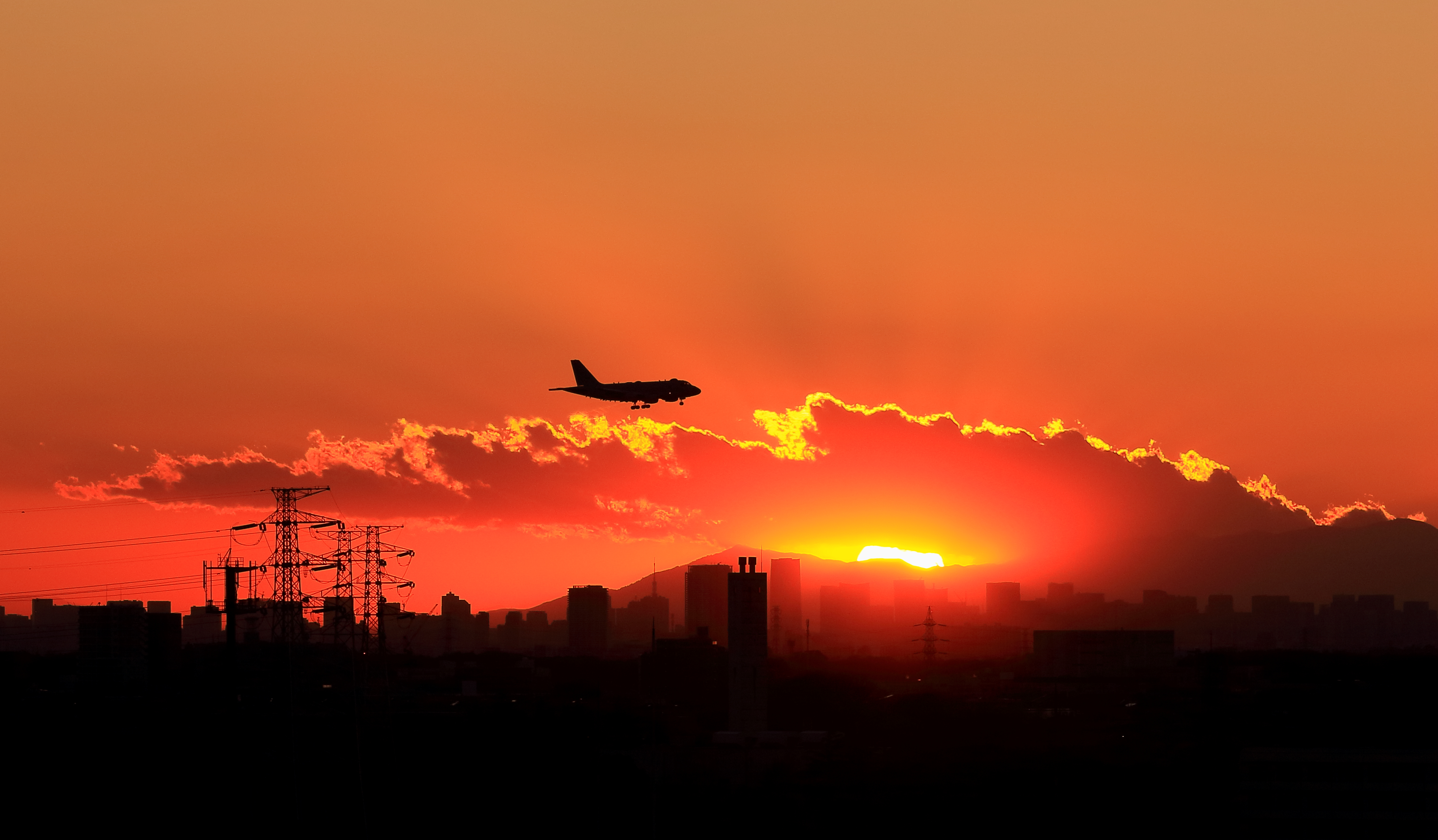 夕日の上を飛ぶ