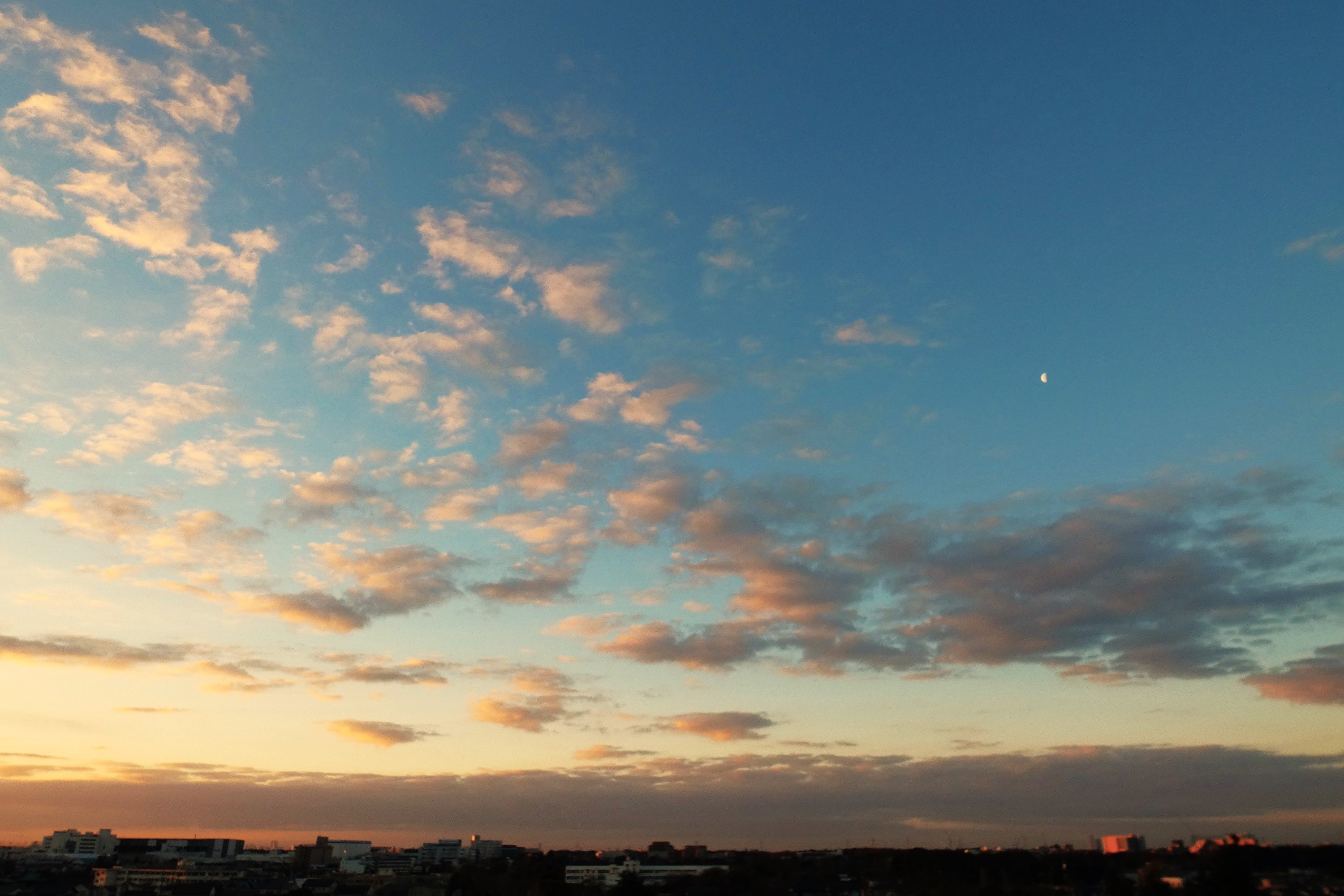 今朝「桃の節句」の日出の約10分後の朝焼け空で、下弦の月が出ていた(写真右側)。朝焼け雲を主役にしたので下弦の月は判り難いが拡大すると確認できると思います。また月の下方には朝日に輝くビルが写っていますが、これは北総線と武蔵野線が交差する「東松戸駅」周辺です。