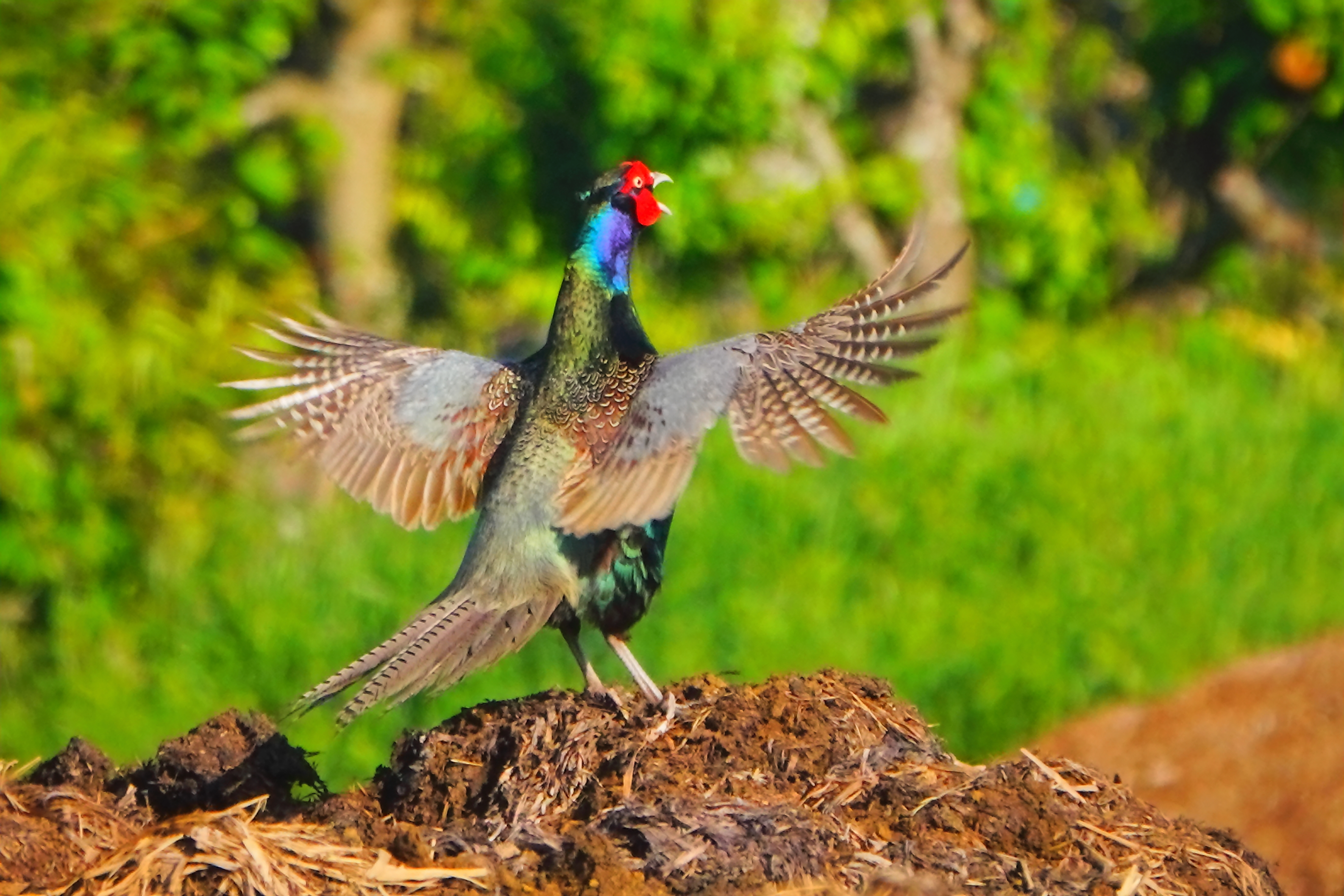 大きく広げた羽を体に打ち付けてケーン、ケーン!