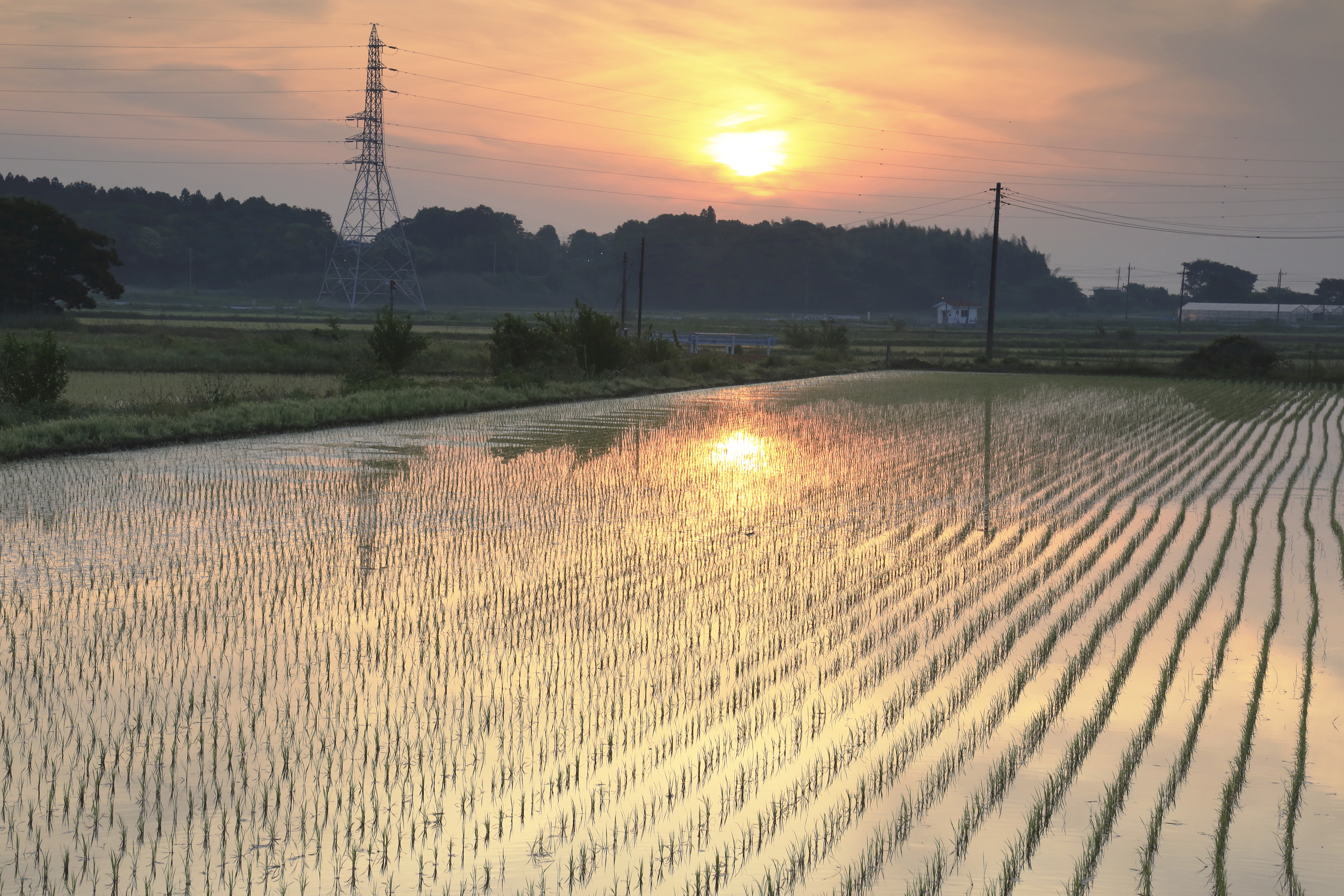 田植えの喧騒を終えて静寂が訪れた近所の水田。橙の朝日色が一層静謐を感じさせました。