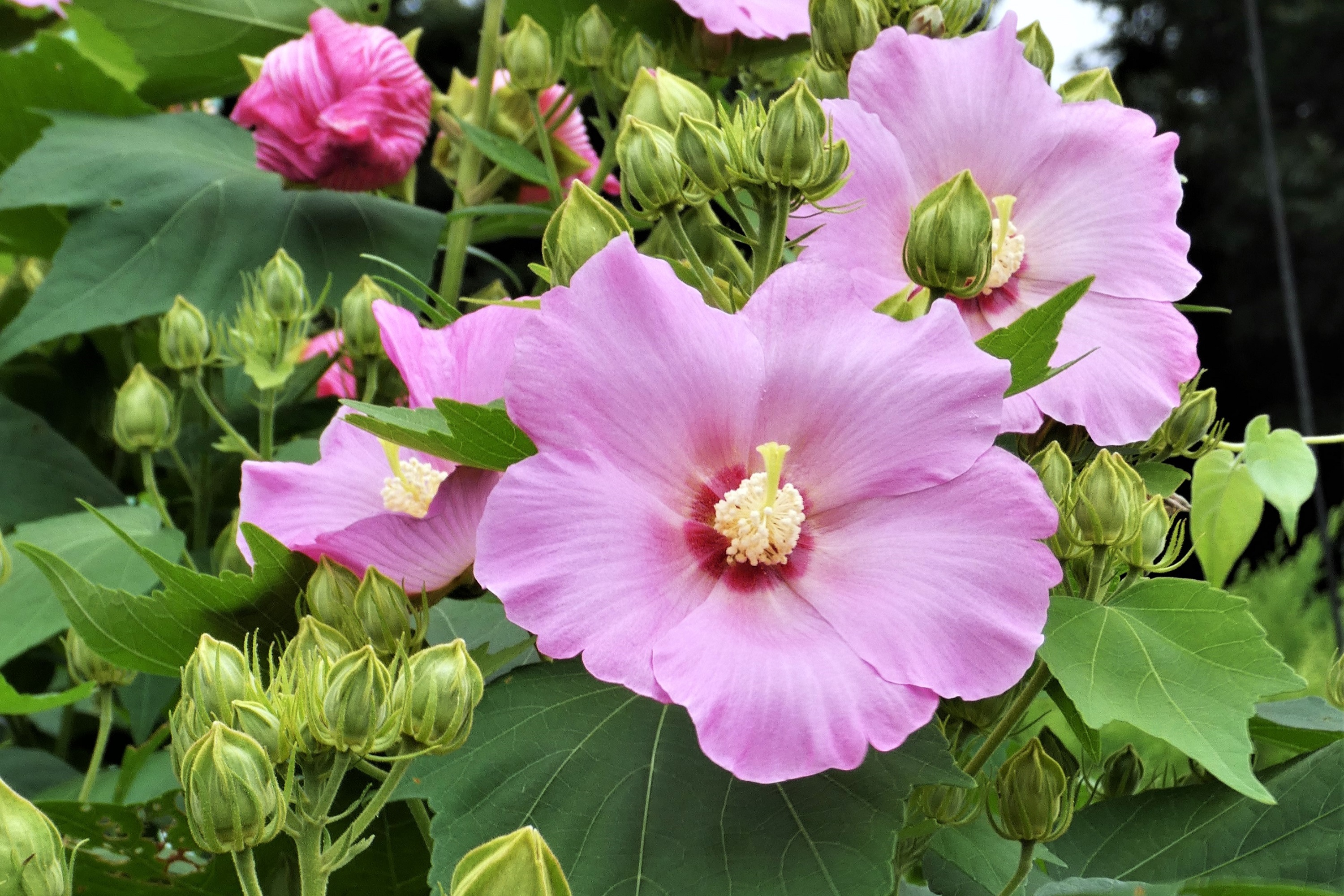 芙蓉は関東以南で栽培されるアオイ科フヨウ属の落葉低木で、7月から10月過ぎまで大輪の花(直径10~15cm程)を咲かせ、庭木などとして植栽されることが多いようです。朝顔のように朝咲いて夕方には萎む花ですが、満開時の威容は素晴らしいものです。写真は団地内の芙蓉で高さ2.5m、形が直径5m程もあり住民の目を楽しませていましたが、なんの理由か昨年根元から切り取られてしまいました。