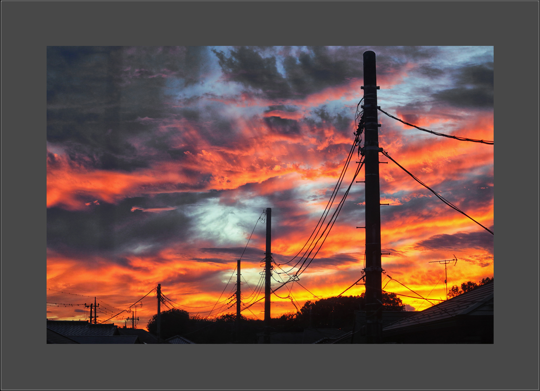 昨夕17:37頃、西の空が見事な夕焼け。気が付くのが遅く、撮りたい場所に行ったのでは夕焼けが終わってしまうので、自宅の窓越しに数枚。(2日前に期待して出かけた時は見事に無駄な時間つぶしになっていたのに~・・・)