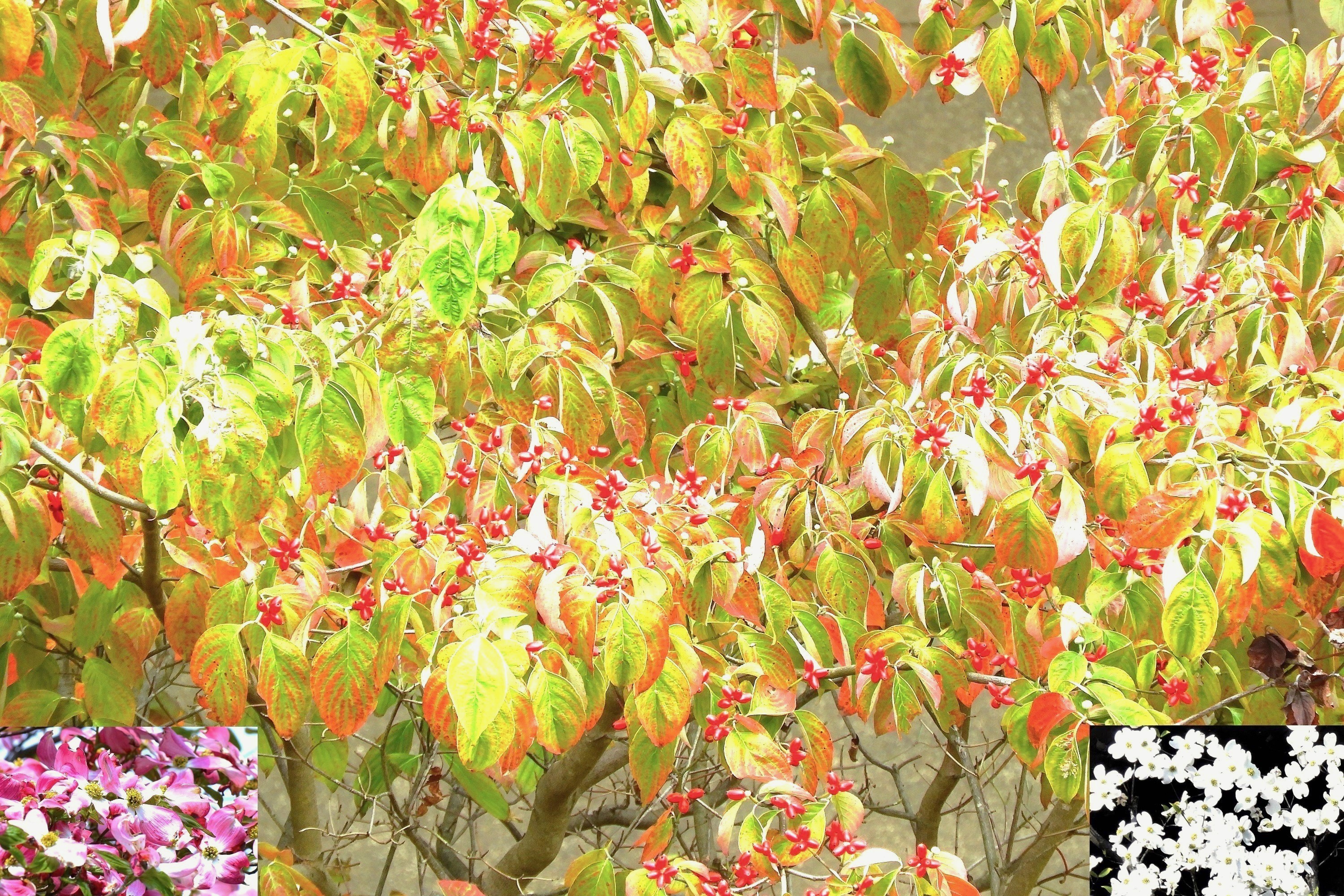団地の花水木(ハナミズキ)がやや紅葉してきた。1912年アメリカから桜の返礼とて日本に贈られたのが花水木で、街路樹などに植えられた。近くの松戸市常盤平には「はなみずき通り」や「はなみずき公園」があります。赤花(写真左下)と白花があり、写真は団地の白花(写真右下)の実です。花弁のように見えるのは総苞片という葉の仲間で、中心が花。写真上部に写っている丸く白いのは蕾で来春開花します。