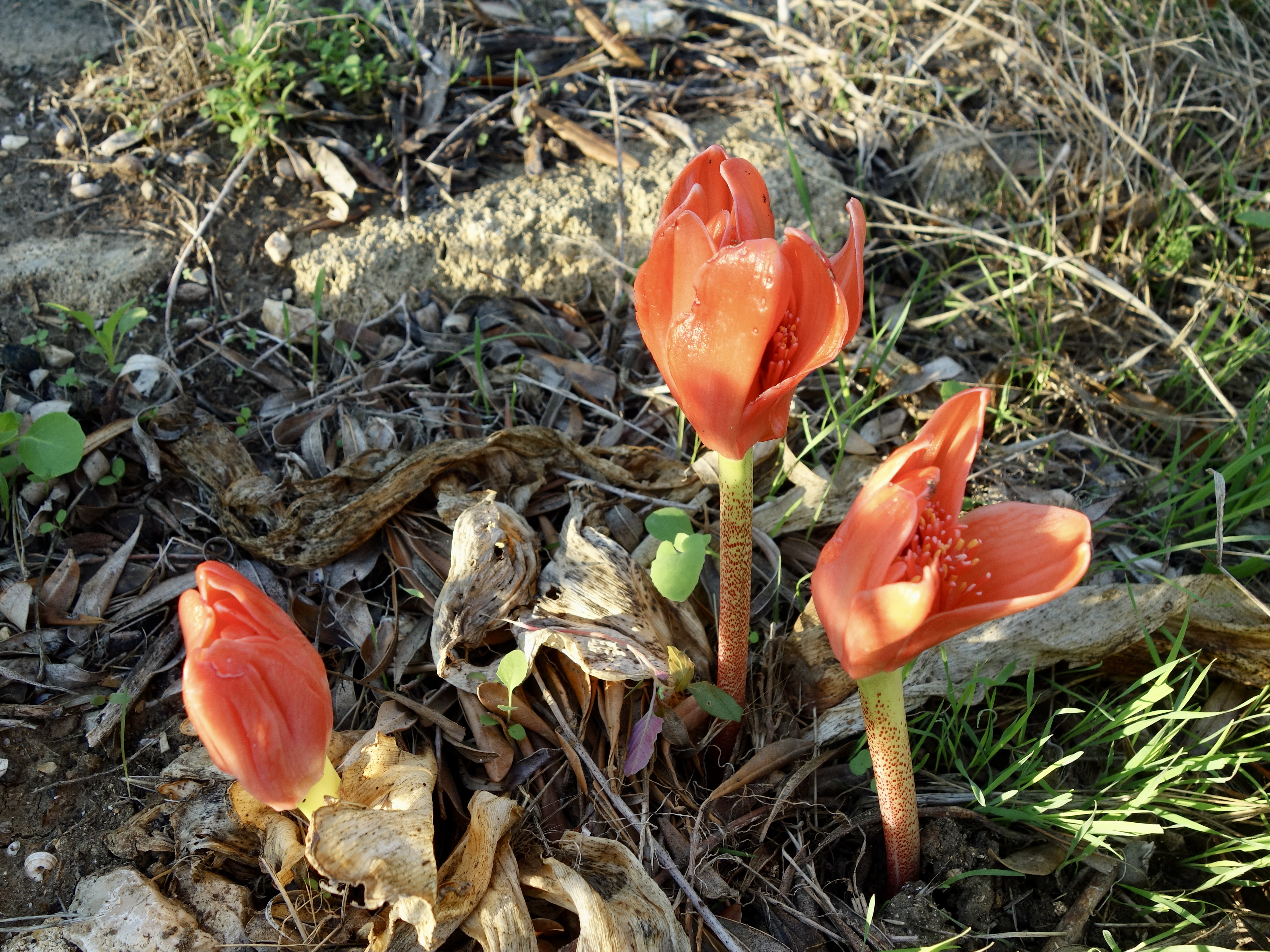 わが家のハエマンサス(Haemanthus coccineus)、咲き出しました。見慣れたけれど、短い茎、すぐ花という、ややバランスのわるい植物。ヒガンバナ科に属し、ヒガンバナが咲くころ、これも咲きます。