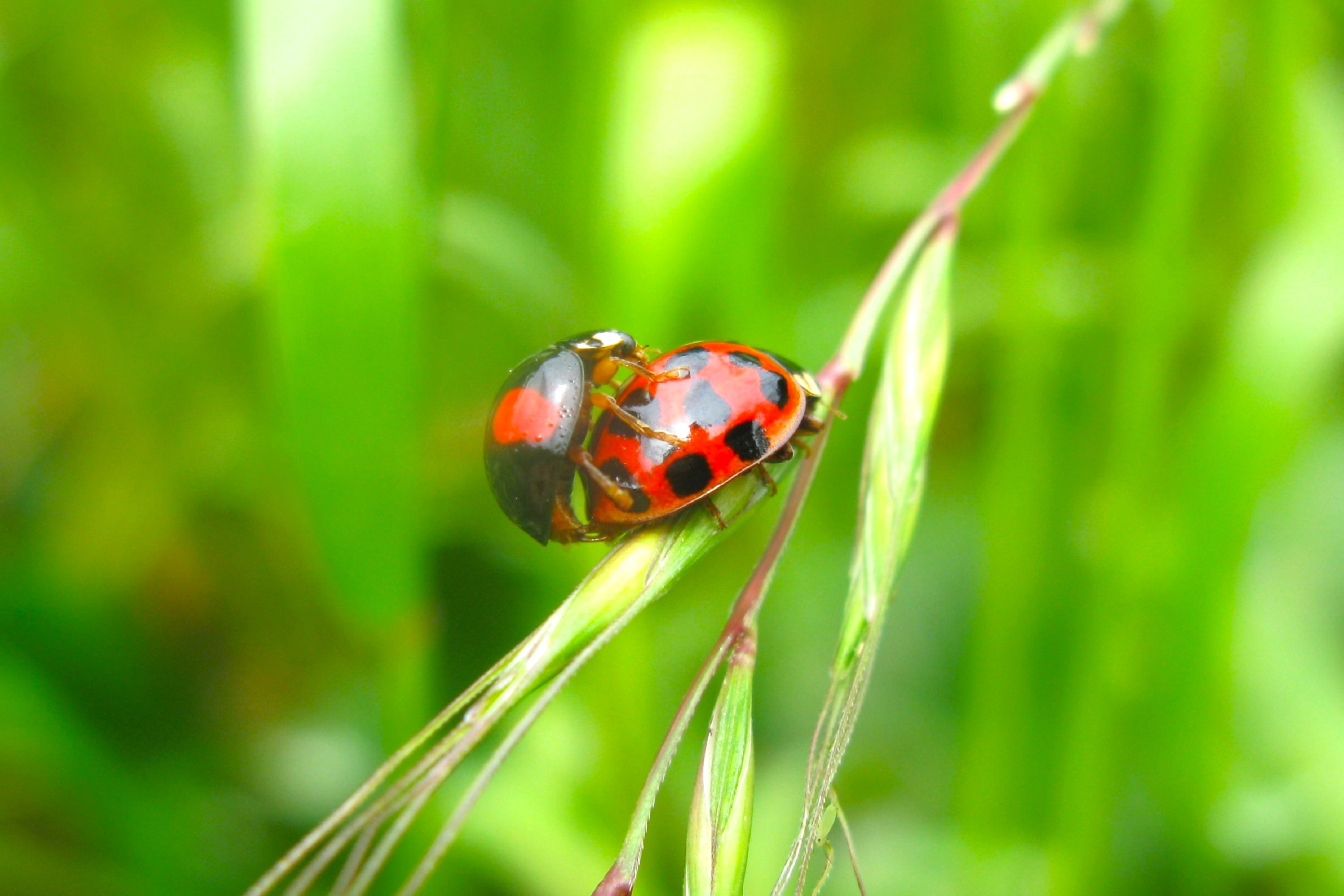 今日は語呂合わせから「天道虫の日(10=テン、トウ)」です。フランス生まれのアニメーション映画の配給・宣伝を行うため㈱東北新社が制定した記念日。写真は世継ぎの子作りに専念する並天道(ナミテントウ・単にテントウムシとも)です。色模様が異なるため別種のように思われますが、並天道は模様が均一ではなく様々な模様が見られ、アブラムシを食べる為に益虫として扱われています。