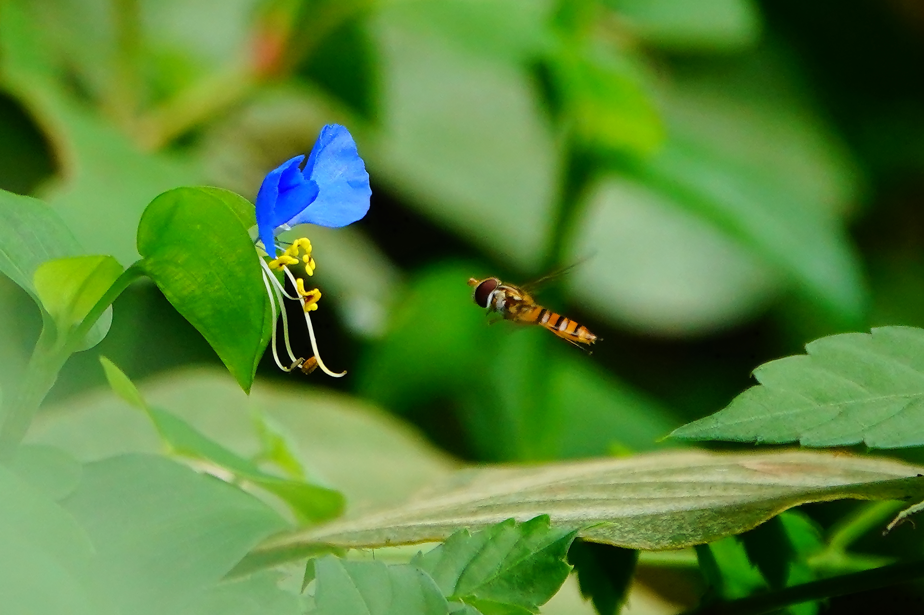 ホバリングしながら露草に接近するホソヒラタアブ。