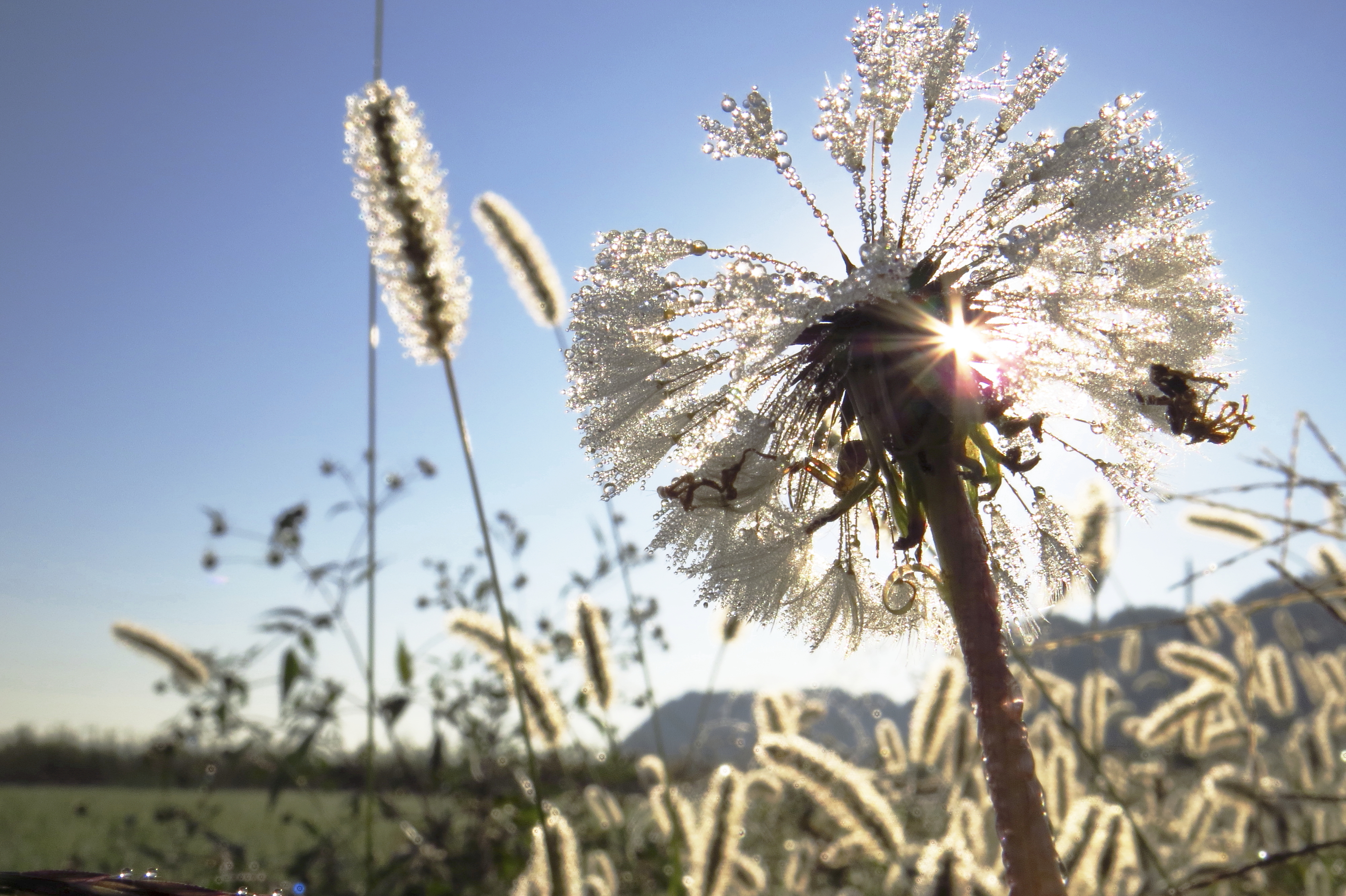 朝露が絡み合うタンポポの綿毛
