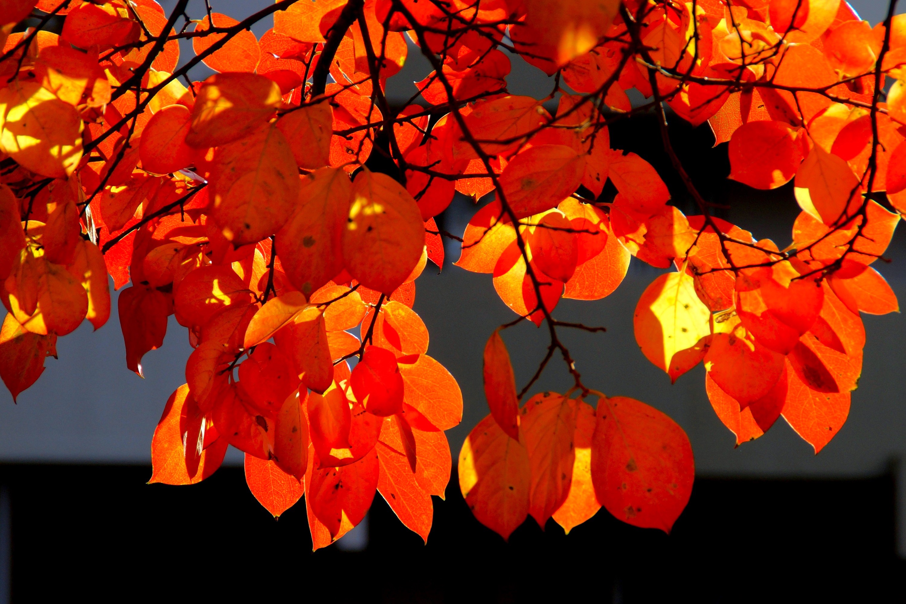 木の種類によって紅葉の遅早(おそはや)があるが、団地内の大島桜は紅葉するとともに散り現在はほとんど散ってしまった。花水木も半分ほどが散ってしまった。写真は秋の晴れた日に、柿の葉に光が当たり照り輝く所謂「照紅葉(てりもみじ・秋の季語)」で、後方におぼろげに映っているのが8階建ての団地です。