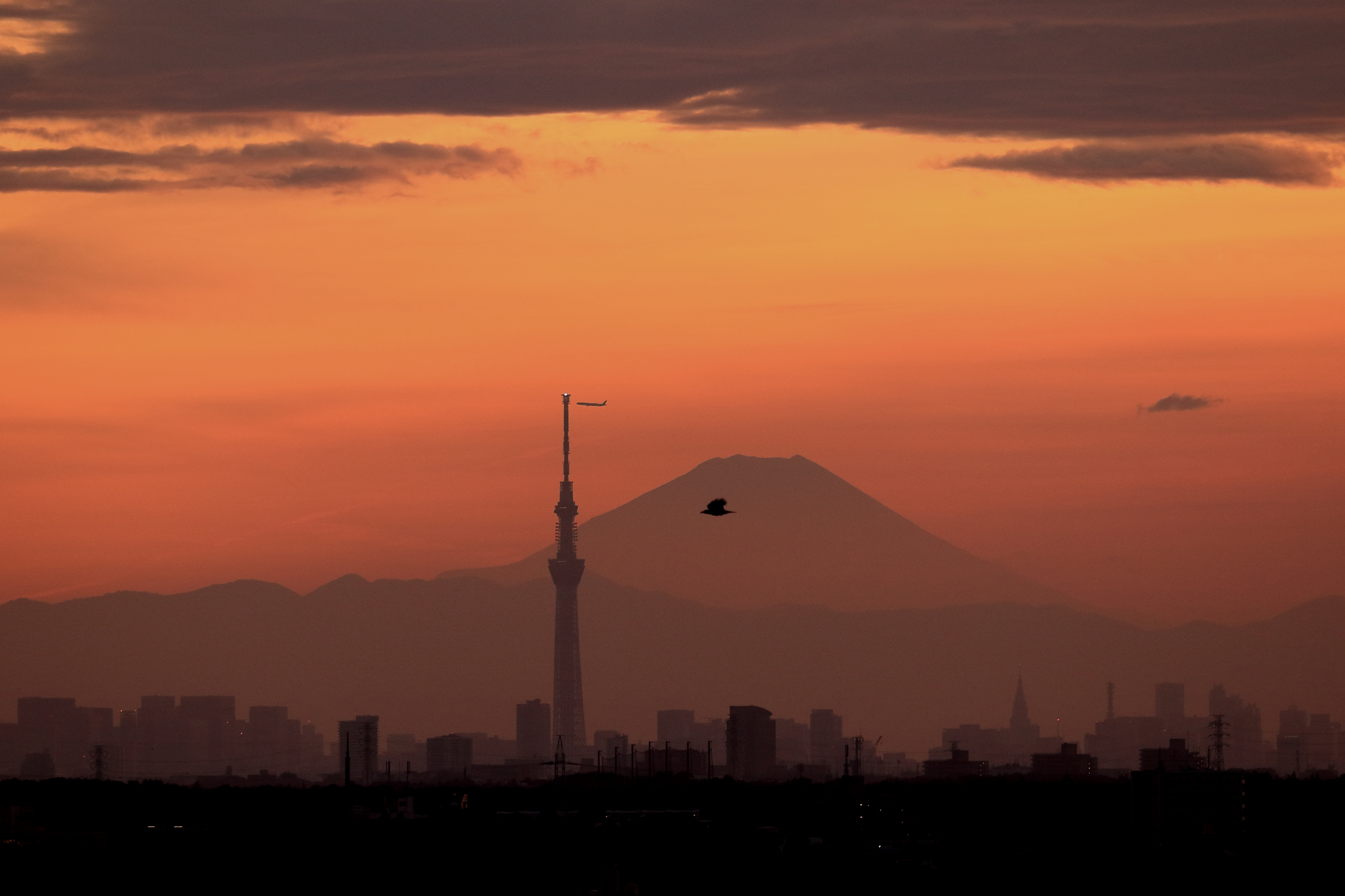 この日は南風。南風運行のため羽田空港に向かう航空機が東京スカイツリーの前を画面左に向かって飛んで