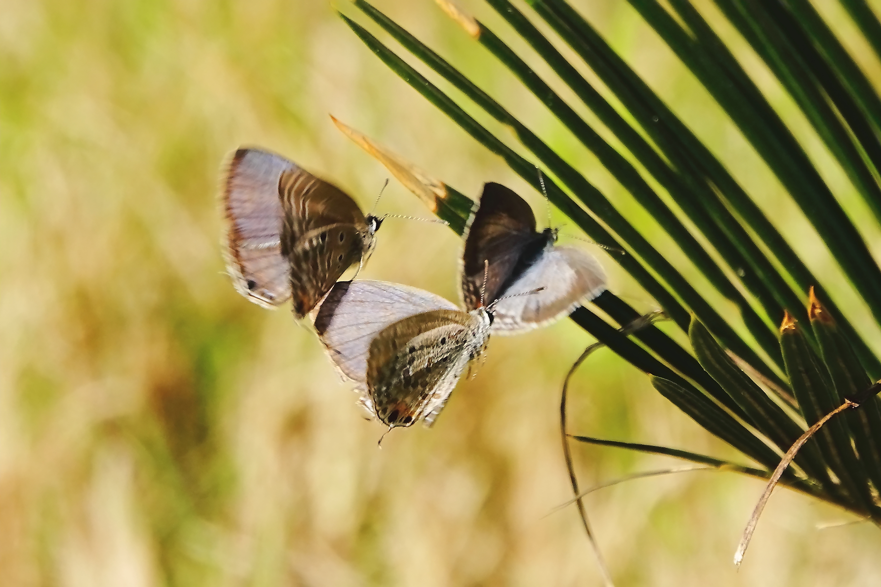 幼虫が蘇鉄(ソテツ)を食草とする「クロマダラソテツシジミ」の成虫3匹がソテツの近くでもつれ合って