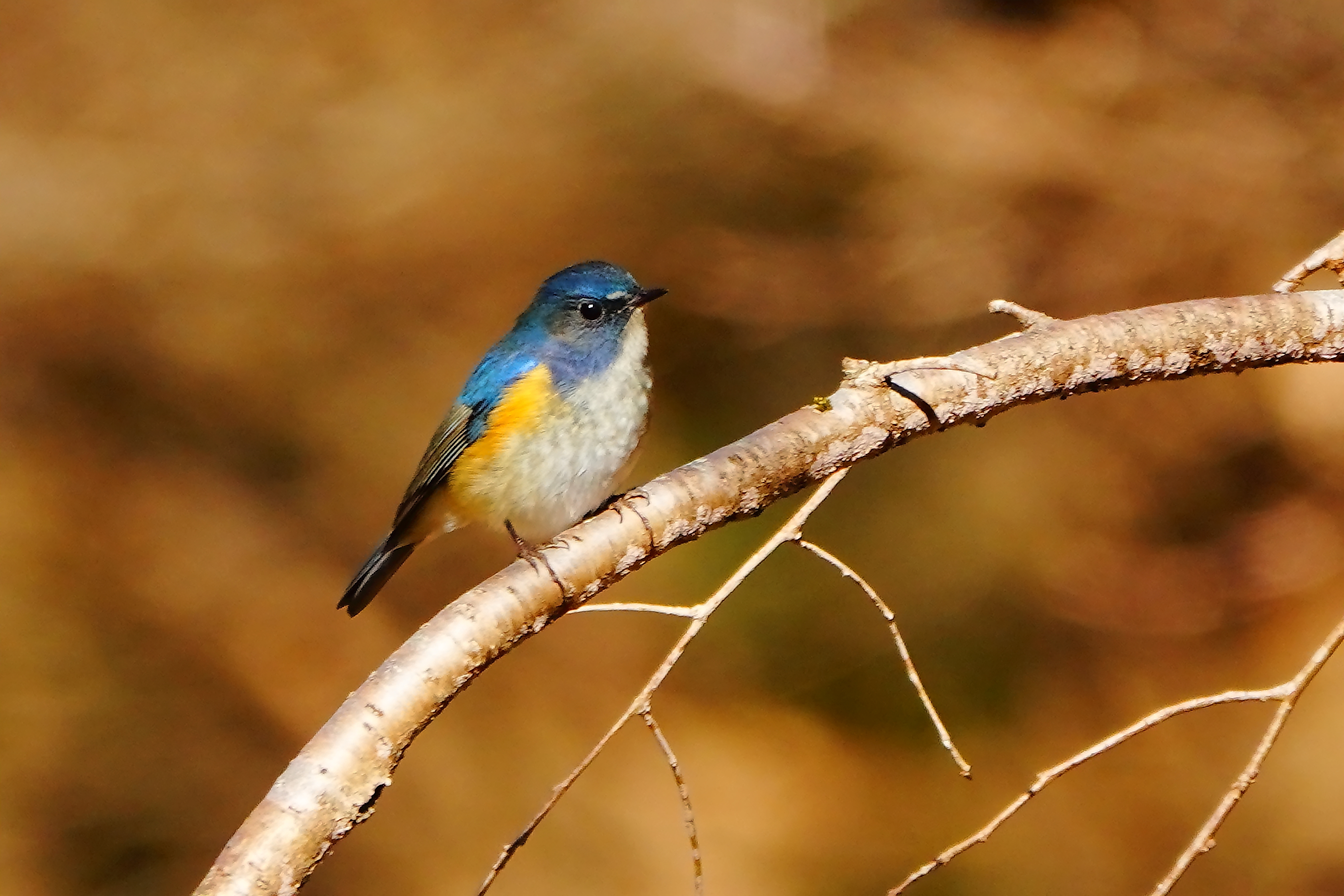 眼の上の白い眉斑が短いルリビタキの雄です。