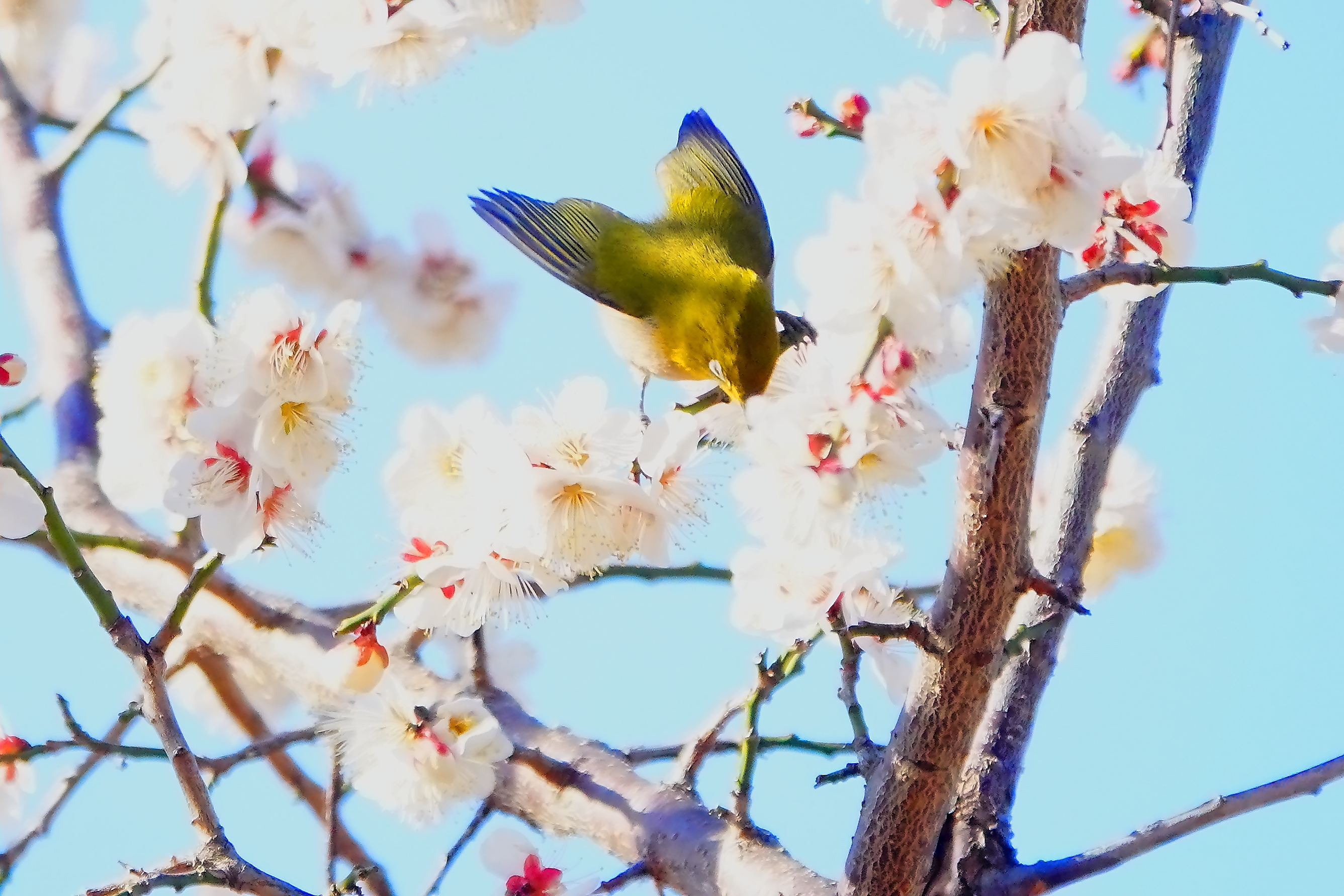白梅が満開。青空を背景に木の上の方でメジロが羽搏きながら吸蜜です。