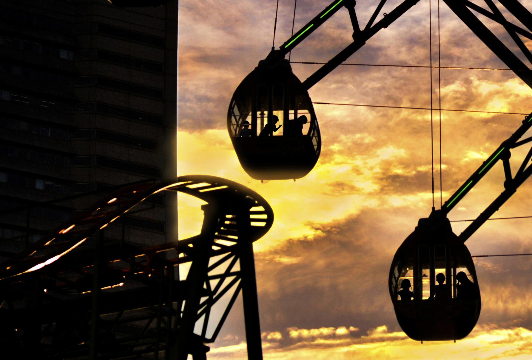 みなとみらい 夕日に浮かぶ大きな観覧車の、小さなかごの物語を撮ってみました。