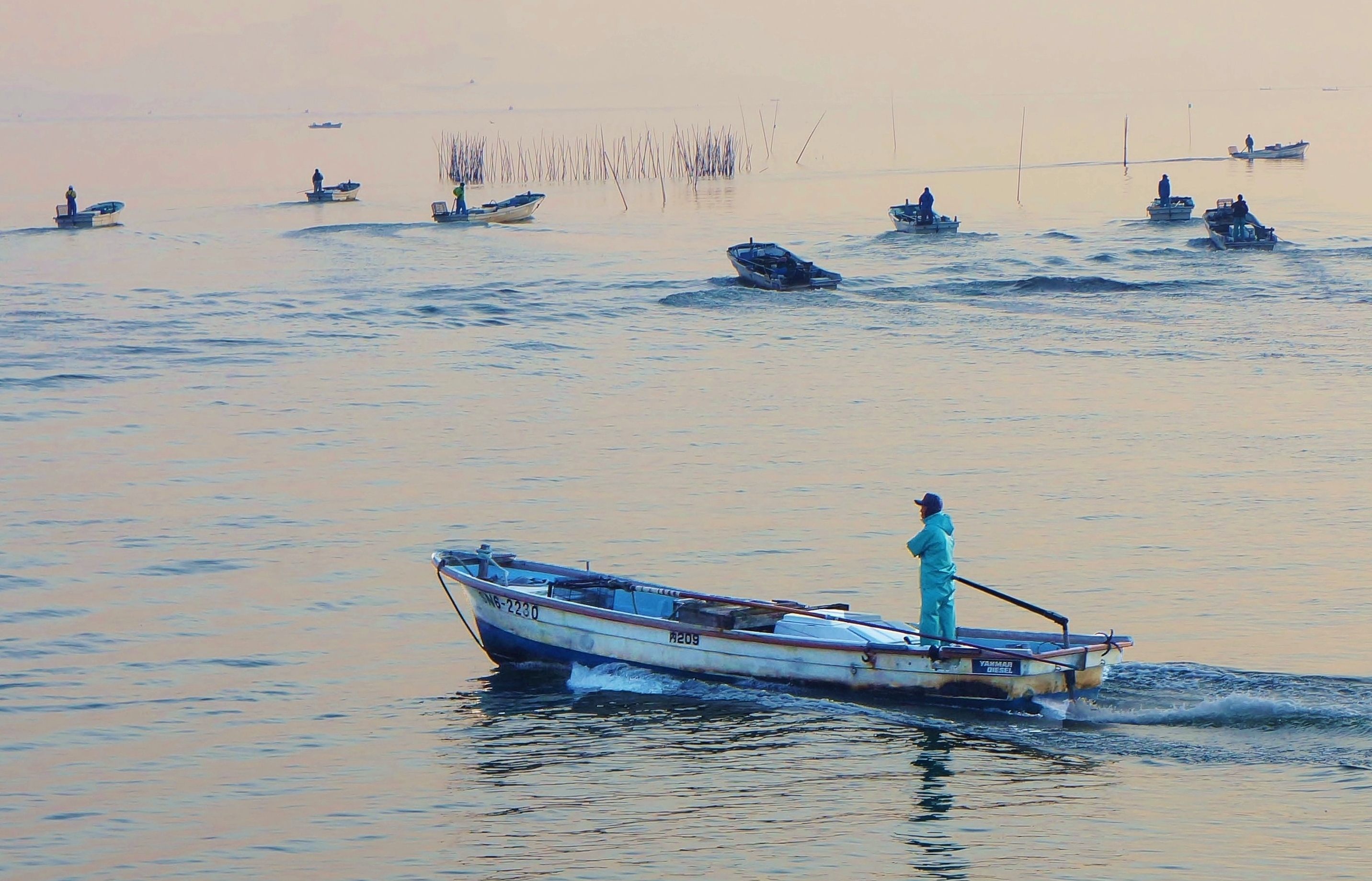 早朝、モーター音とともに十数台の漁船が一斉に沖にでる時で…