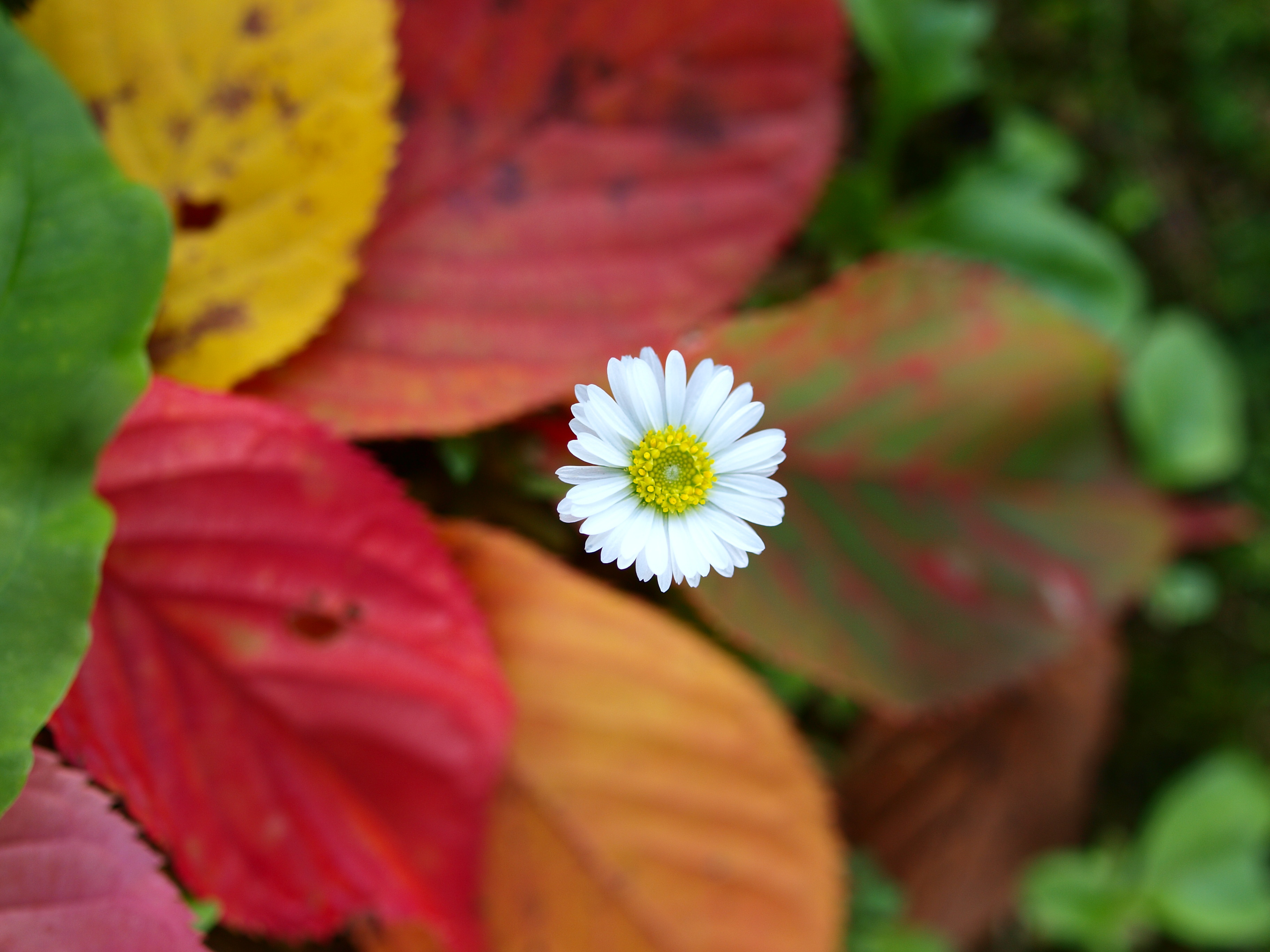 2016年3月に閉校する小学校の庭を歩いていたら小さな花がぽつんと咲いていました。可憐で寂しそうな花だったので周りにあった色とりどりの落葉を集めて写してあげました。(花の直径1cm、背丈約5cm。花の名は源平小菊?。)