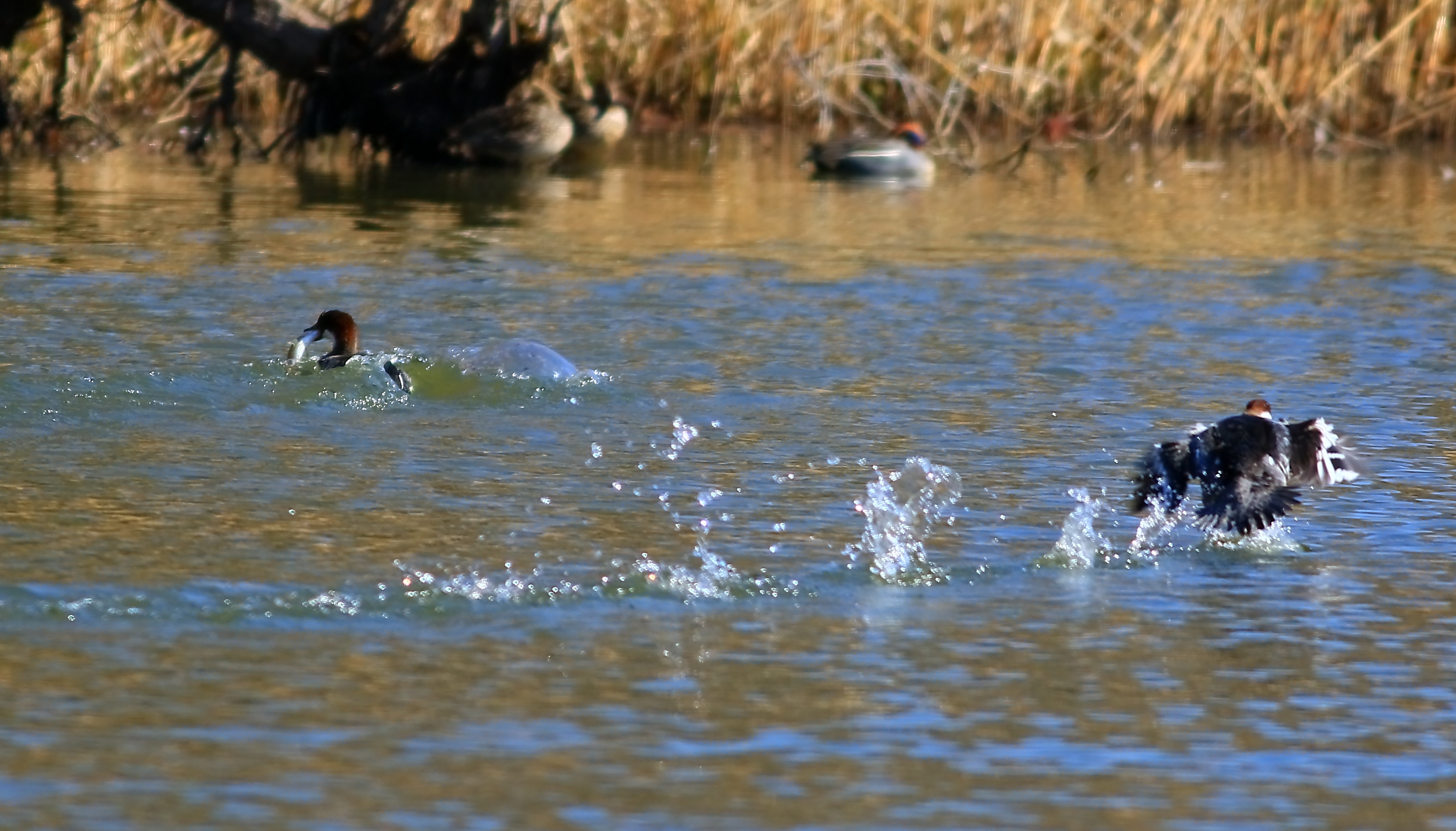 大きな魚を捕獲した雌のミコアイサ、もう1羽に追い掛けられましたが、見事逃げ切りました。