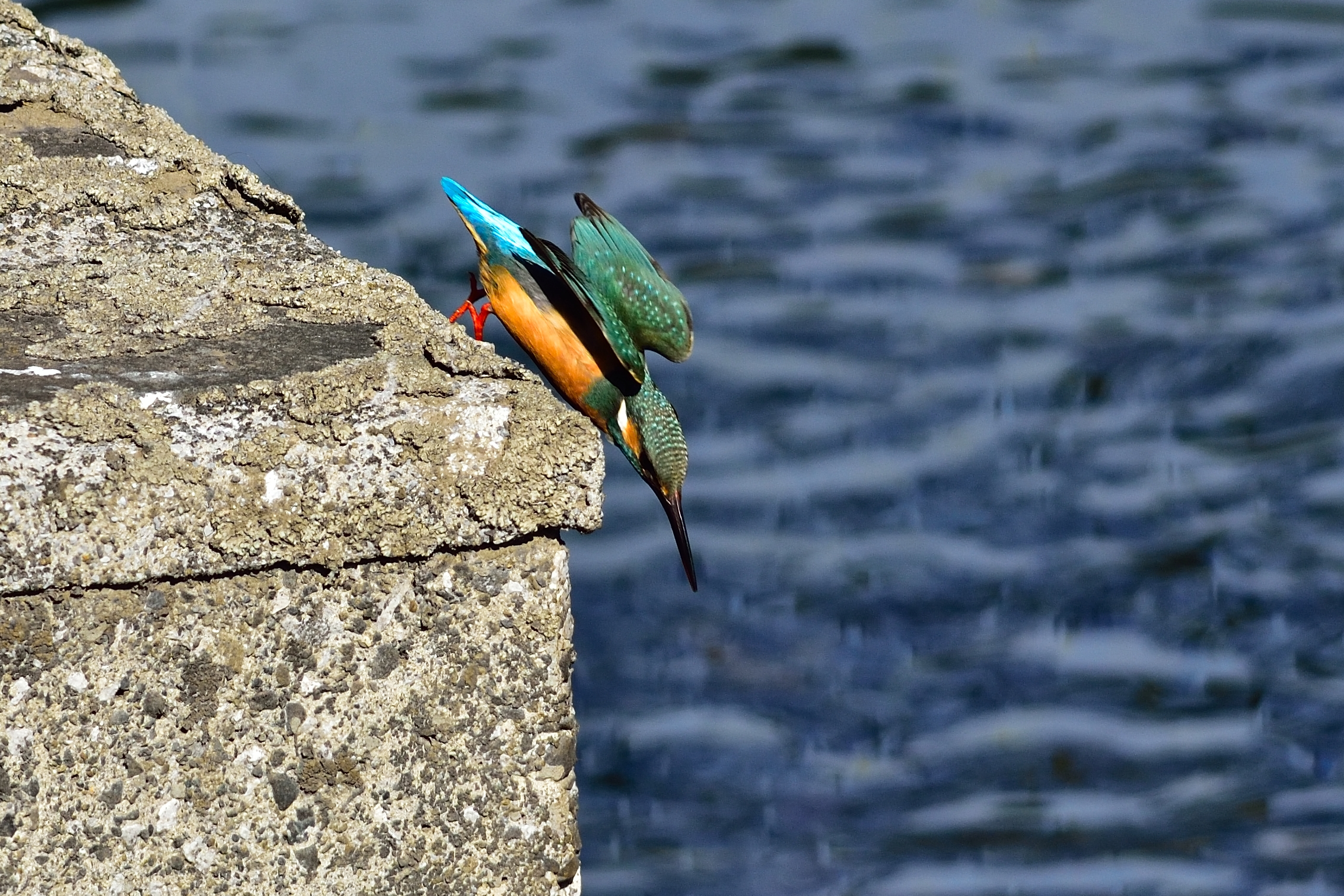 近所の川にて、護岸から餌めがけてダイブする主さん。