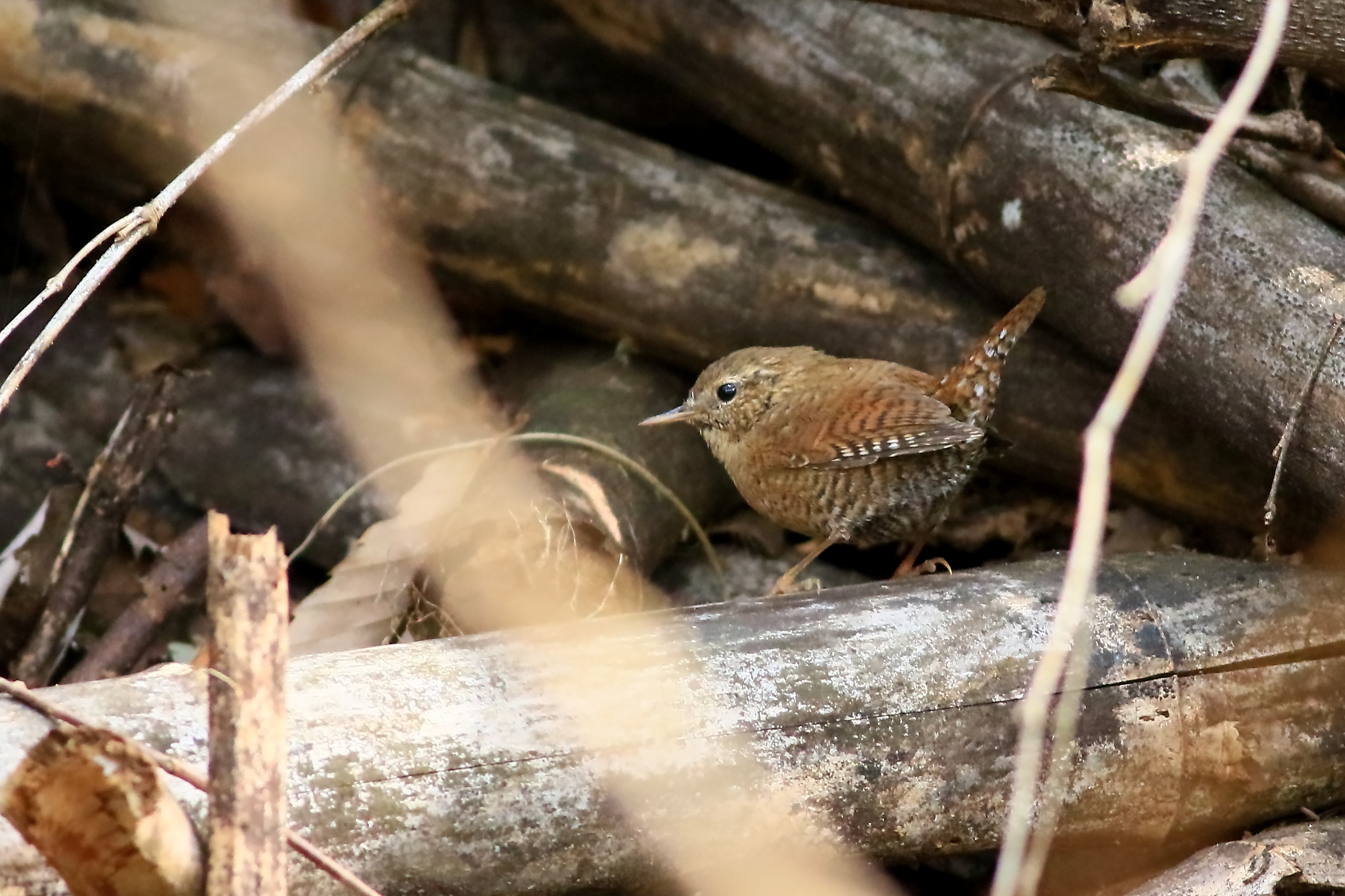 崖下の薄暗い倒れた古い竹の山の間から姿を見せたミソサザイです。