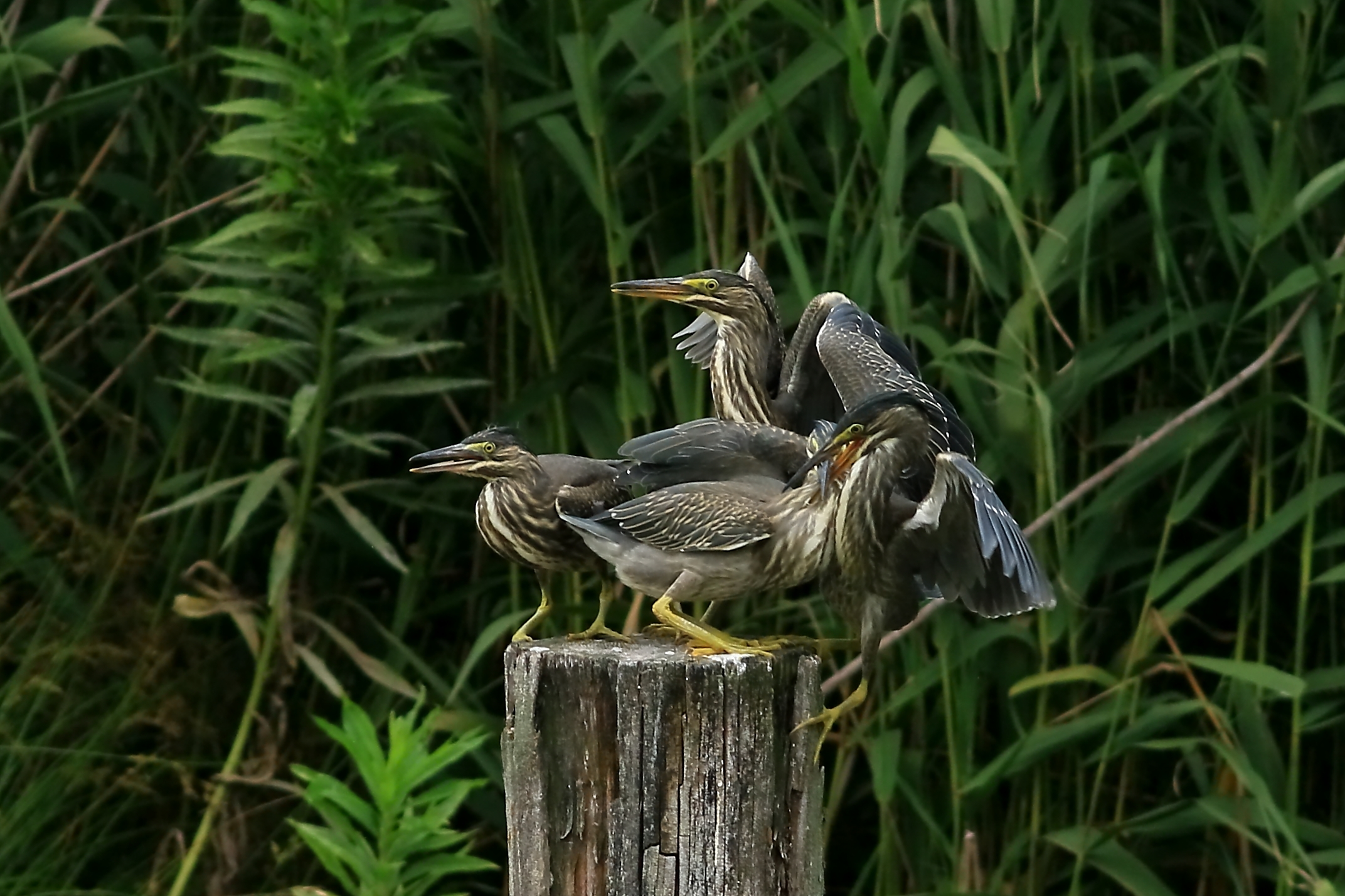 ササゴイの4きょうだい、2羽が止まっていた杭に両側から別の2羽が割り込んできました。