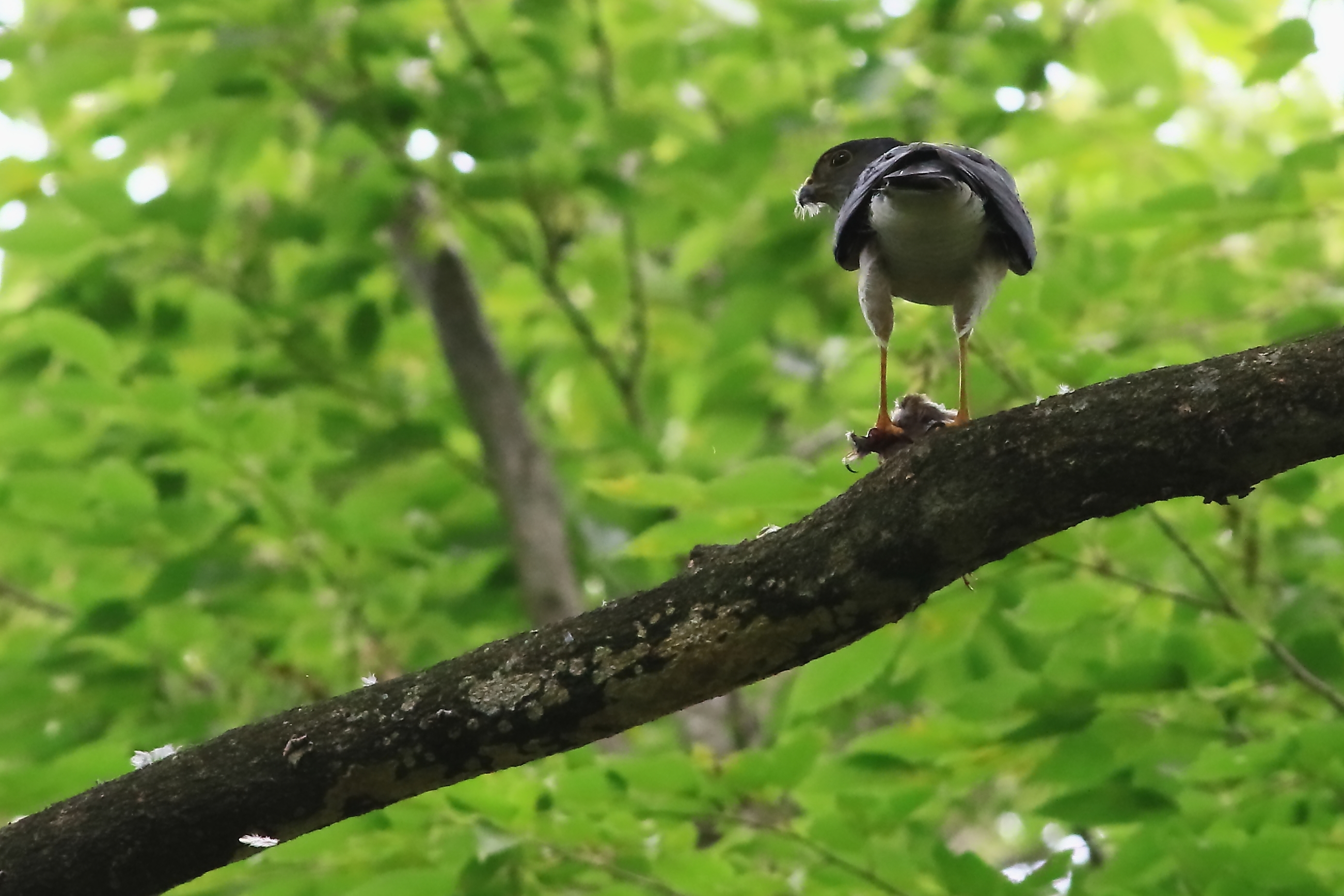 【ツミの餌渡しⅢ:5連作の1】  ツミは基本的に雄が狩りをして雌に渡し、雌はこれを巣に運び雛に