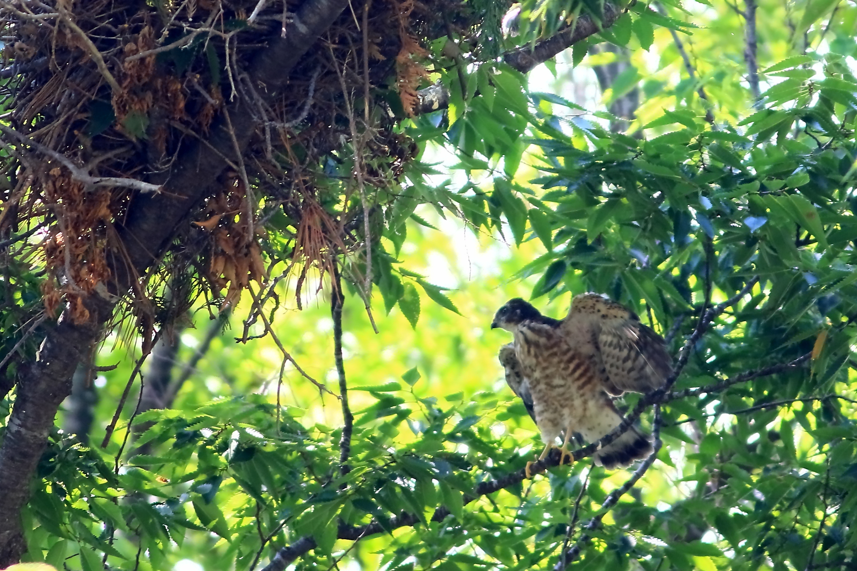ツミの雛4羽の内漸く最初に孵った雛が巣から飛び出しました! でもまだ巣(左上)のすぐ傍で